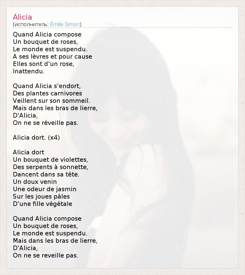 Quand Alicia compose Un bouquet de roses, Le monde est suspendu. A ses lèvres et pour cause Elles sont d'un rose, Inattendu. Quand Alicia s'endort, Des plantes carnivores Veillent sur son sommeil. Mais dans les bras de lierre, D'Alicia, On ne se réveille pas. Alicia dort. (x4) Alicia dort Un bouquet de violettes, Des serpents à sonnette, Dancent dans sa tête. Un doux venin Une odeur de jasmin Sur les joues pâles D'une fille végétale Quand Alicia compose Un bouquet de roses, Le monde est suspendu. Mais dans les bras de lierre, D'Alicia, On ne se reveille pas.