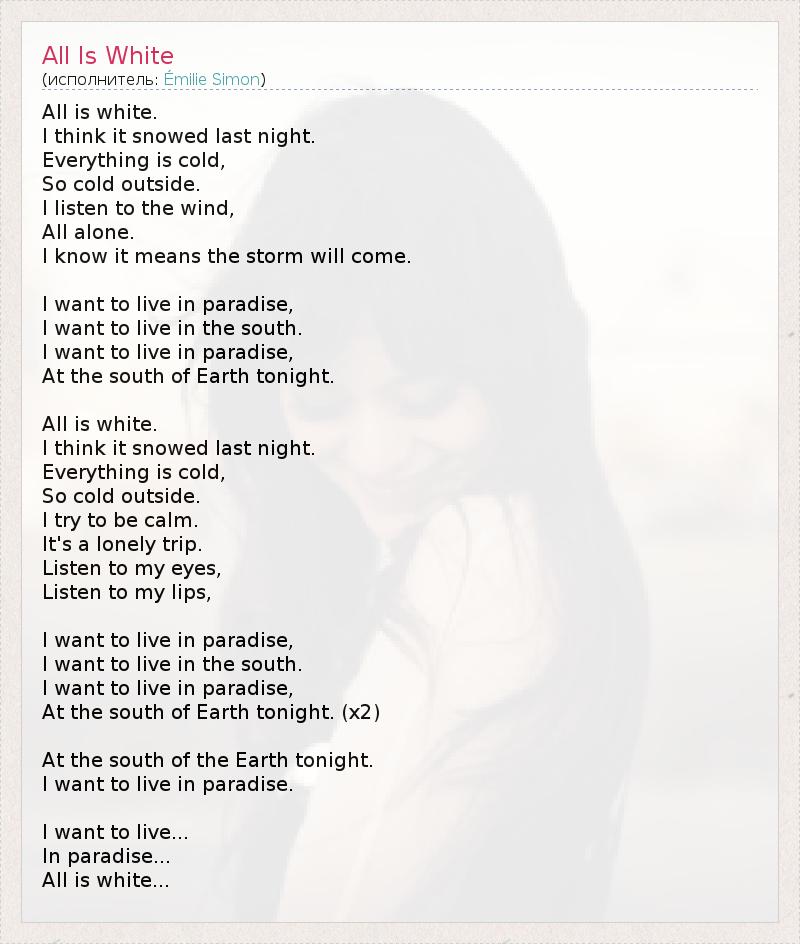 Белым-бело. Думаю, ночью был снег. Так холодно, Но лишь снаружи. Я слушаю ветер, В полном одиночестве. Я знаю: это значит, что будет буря. Я хочу жить в раю, Я хочу жить на юге. Я хочу жить в раю, На юге Земли. Белым-бело. Думаю, ночью был снег. Так холодно, Но лишь снаружи. Стараюсь быть спокойной. Это одинокий поход. Читай по глазам, Читай по губам. Я хочу жить в раю, Я хочу жить на юге. Я хочу жить в раю, На юге Земли. [x2] На юге Земли Я хочу жить в раю. Я хочу жить... В раю... Белым-бело...