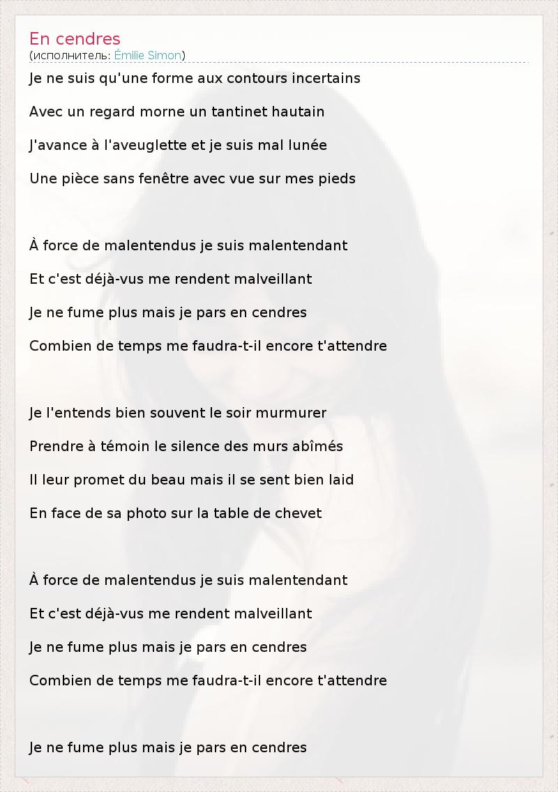 Je ne suis qu'une forme aux contours incertains Avec un regard morne un tantinet hautain J'avance à l'aveuglette et je suis mal lunée Une pièce sans fenêtre avec vue sur mes pieds À force de malentendus je suis malentendant Et c'est déjà-vus me rendent malveillant Je ne fume plus mais je pars en cendres Combien de temps me faudra-t-il encore t'attendre Je l'entends bien souvent le soir murmurer Prendre à témoin le silence des murs abîmés Il leur promet du beau mais il se sent bien laid En face de sa photo sur la table de chevet À force de malentendus je suis malentendant Et c'est déjà-vus me rendent malveillant Je ne fume plus mais je pars en cendres Combien de temps me faudra-t-il encore t'attendre Je ne fume plus mais je pars en cendres