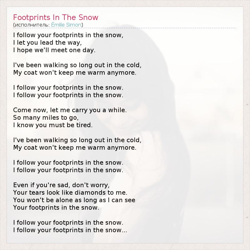 I follow your footprints in the snow, I let you lead the way, I hope we'll meet one day. I've been walking so long out in the cold, My coat won't keep me warm anymore. I follow your footprints in the snow. I follow your footprints in the snow. Come now, let me carry you a while. So many miles to go, I know you must be tired. I've been walking so long out in the cold, My coat won't keep me warm anymore. I follow your footprints in the snow. I follow your footprints in the snow. Even if you're sad, don't worry, Your tears look like diamonds to me. You won't be alone as long as I can see Your footprints in the snow. I follow your footprints in the snow. I follow your footprints in the snow...