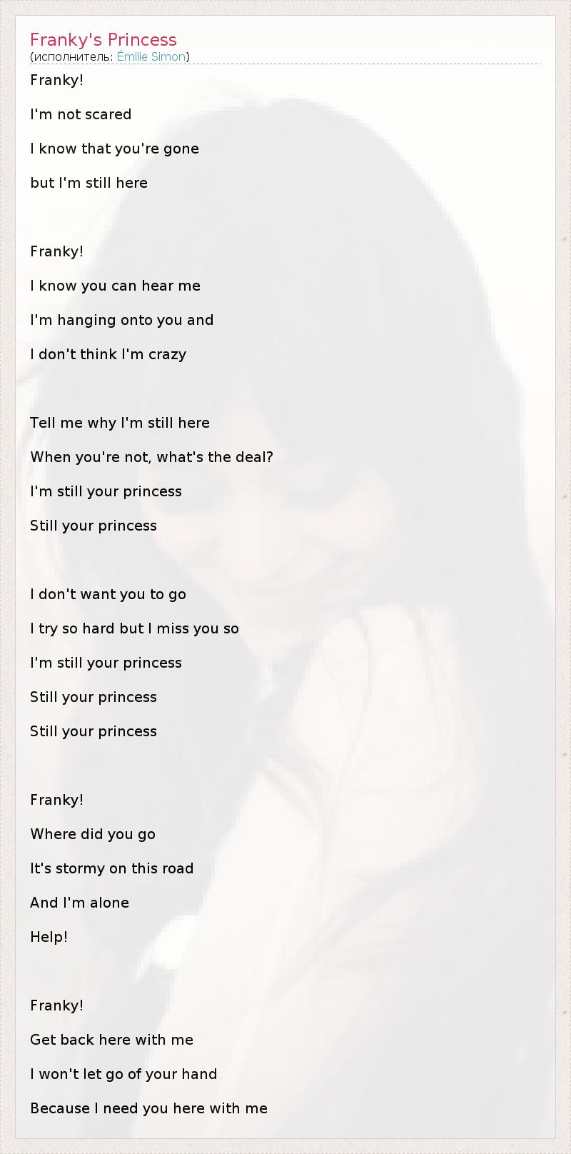Franky! I'm not scared I know that you're gone but I'm still here Franky! I know you can hear me I'm hanging onto you and I don't think I'm crazy Tell me why I'm still here When you're not, what's the deal? I'm still your princess Still your princess I don't want you to go I try so hard but I miss you so I'm still your princess Still your princess Still your princess Franky! Where did you go It's stormy on this road And I'm alone Help! Franky! Get back here with me I won't let go of your hand Because I need you here with me