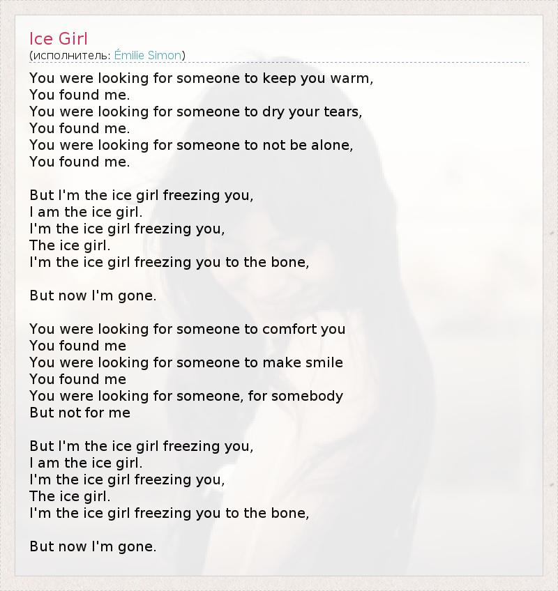 You were looking for someone to keep you warm, You found me. You were looking for someone to dry your tears, You found me. You were looking for someone to not be alone, You found me. But I'm the ice girl freezing you, I am the ice girl. I'm the ice girl freezing you, The ice girl. I'm the ice girl freezing you to the bone, But now I'm gone. You were looking for someone to comfort you You found me You were looking for someone to make smile You found me You were looking for someone, for somebody But not for me But I'm the ice girl freezing you, I am the ice girl. I'm the ice girl freezing you, The ice girl. I'm the ice girl freezing you to the bone, But now I'm gone.