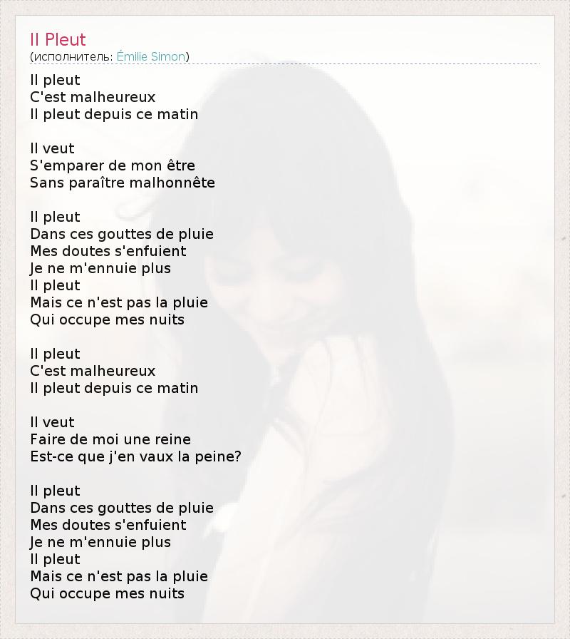 Il pleut C'est Малёрэ Il pleut Depuis се Matin Il veut S'emparer де пн être Без paraître malhonnête Il pleut Dans CES ГУТТ де Pluie Mes doutes s'enfuient Je пе m'ennuie плюс Il pleut Mais се n'est па- ла Pluie Квай occupe мес Nuits Il pleut C'est Малёрэ Il pleut Depuis се Matin Il veut Faire де Moi Une Reine Est- се дие J'en Вокс ла Пайне ? Il pleut Dans CES ГУТТ де Pluie Mes doutes s'enfuient Je пе m'ennuie плюс Il pleut Mais се n'est па- ла Pluie Квай occupe мес Nuits