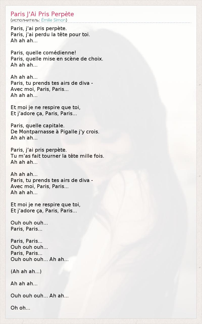 Париж, я покорена навечно. Париж, земля уходит из под ног из-за тебя. Ай-яй-яй... Париж, что за артист! Париж, что за мизансцена выбора. Ай-яй-яй. Ай-яй-яй... Париж, ты завладел поющей дивой - Мной. Париж, Париж... Ай-яй-яй... И я дышу только тобой, И я люблю тебя, Париж, Париж... Париж, столица. От Монпарнаса до Пигаль, я считаю. Ай-яй-яй... Париж, я покорена навечно. Ты заставил меня одуматься тысячу раз. Ай-яй-яй... Ай-яй-яй... Париж, ты завладел поющей дивой - Мной. Париж, Париж... Ай-яй-яй... И я дышу только тобой, И я люблю тебя, Париж, Париж... У-у-у... Париж, Париж... Париж, Париж... У-у-у... Париж, Париж... У-у-у... А-а... (Ай-яй-яй...) Ай-яй-яй... У-у-у... А-а... О-о...