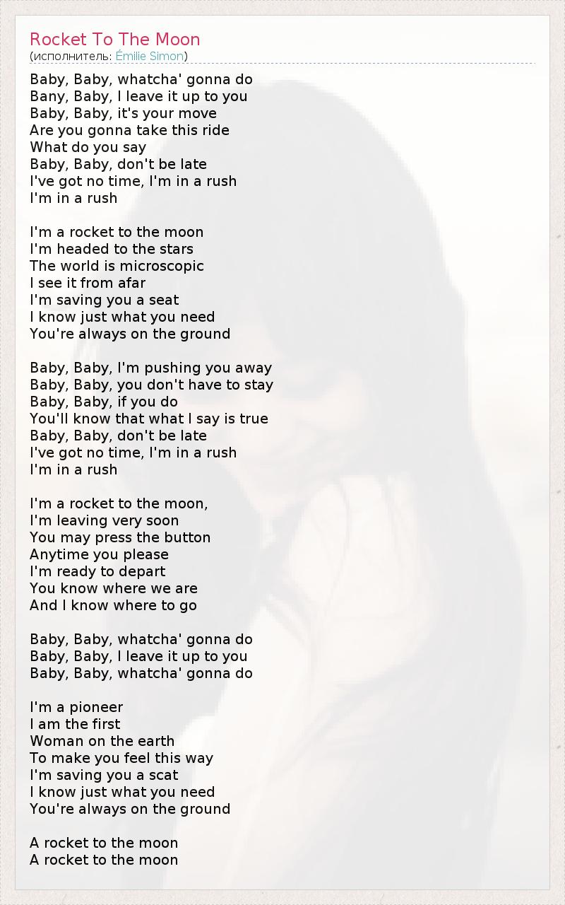 Baby, Baby, whatcha' gonna do Bany, Baby, I leave it up to you Baby, Baby, it's your move Are you gonna take this ride What do you say Baby, Baby, don't be late I've got no time, I'm in a rush I'm in a rush I'm a rocket to the moon I'm headed to the stars The world is microscopic I see it from afar I'm saving you a seat I know just what you need You're always on the ground Baby, Baby, I'm pushing you away Baby, Baby, you don't have to stay Baby, Baby, if you do You'll know that what I say is true Baby, Baby, don't be late I've got no time, I'm in a rush I'm in a rush I'm a rocket to the moon, I'm leaving very soon You may press the button Anytime you please I'm ready to depart You know where we are And I know where to go Baby, Baby, whatcha' gonna do Baby, Baby, I leave it up to you Baby, Baby, whatcha' gonna do I'm a pioneer I am the first Woman on the earth To make you feel this way I'm saving you a scat I know just what you need You're always on the ground A rocket to the moon A rocket to the moon