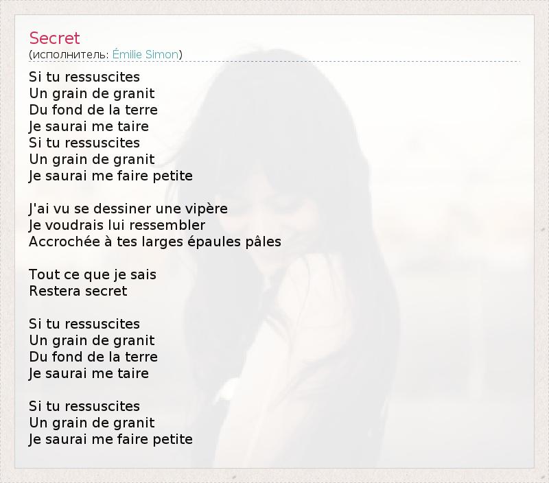 Si tu ressuscites Un grain de granit Du fond de la terre Je saurai me taire Si tu ressuscites Un grain de granit Je saurai me faire petite J'ai vu se dessiner une vipère Je voudrais lui ressembler Accrochée à tes larges épaules pâles Tout ce que je sais Restera secret Si tu ressuscites Un grain de granit Du fond de la terre Je saurai me taire Si tu ressuscites Un grain de granit Je saurai me faire petite