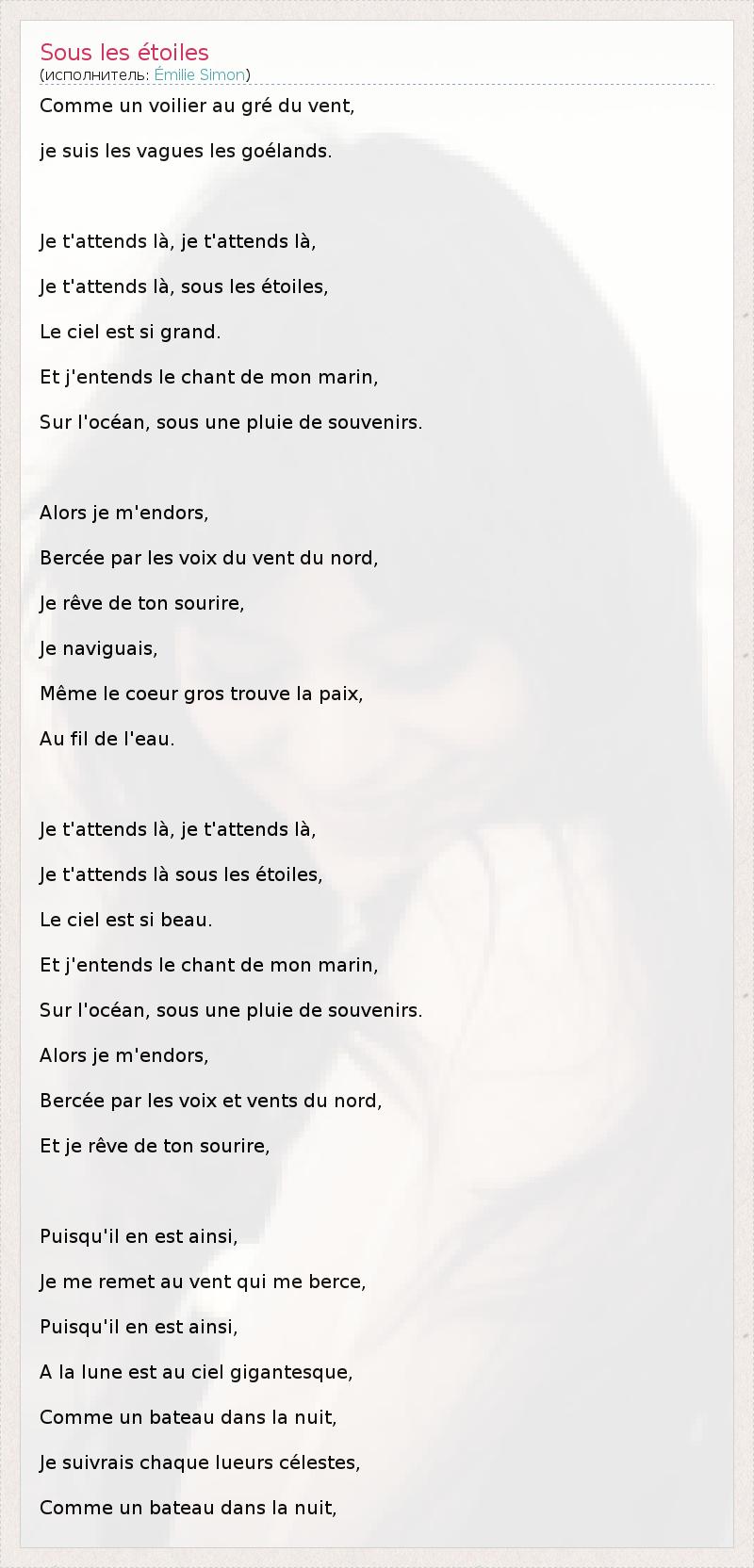 Comme un voilier au gré du vent, je suis les vagues les goélands. Je t'attends là, je t'attends là, Je t'attends là, sous les étoiles, Le ciel est si grand. Et j'entends le chant de mon marin, Sur l'océan, sous une pluie de souvenirs. Alors je m'endors, Bercée par les voix du vent du nord, Je rêve de ton sourire, Je naviguais, Même le coeur gros trouve la paix, Au fil de l'eau. Je t'attends là, je t'attends là, Je t'attends là sous les étoiles, Le ciel est si beau. Et j'entends le chant de mon marin, Sur l'océan, sous une pluie de souvenirs. Alors je m'endors, Bercée par les voix et vents du nord, Et je rêve de ton sourire, Puisqu'il en est ainsi, Je me remet au vent qui me berce, Puisqu'il en est ainsi, A la lune est au ciel gigantesque, Comme un bateau dans la nuit, Je suivrais chaque lueurs célestes, Comme un bateau dans la nuit,
