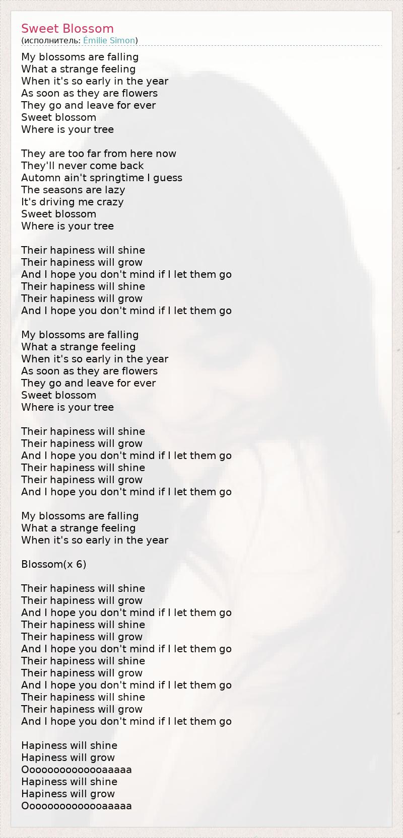 My blossoms are falling What a strange feeling When it's so early in the year As soon as they are flowers They go and leave for ever Sweet blossom Where is your tree They are too far from here now They'll never come back Automn ain't springtime I guess The seasons are lazy It's driving me crazy Sweet blossom Where is your tree Their hapiness will shine Their hapiness will grow And I hope you don't mind if I let them go Their hapiness will shine Their hapiness will grow And I hope you don't mind if I let them go My blossoms are falling What a strange feeling When it's so early in the year As soon as they are flowers They go and leave for ever Sweet blossom Where is your tree Their hapiness will shine Their hapiness will grow And I hope you don't mind if I let them go Their hapiness will shine Their hapiness will grow And I hope you don't mind if I let them go My blossoms are falling What a strange feeling When it's so early in the year Blossom(x 6) Their hapiness will shine Their hapiness will grow And I hope you don't mind if I let them go Their hapiness will shine Their hapiness will grow And I hope you don't mind if I let them go Their hapiness will shine Their hapiness will grow And I hope you don't mind if I let them go Their hapiness will shine Their hapiness will grow And I hope you don't mind if I let them go Hapiness will shine Hapiness will grow Oooooooooooooaaaaa Hapiness will shine Hapiness will grow Oooooooooooooaaaaa