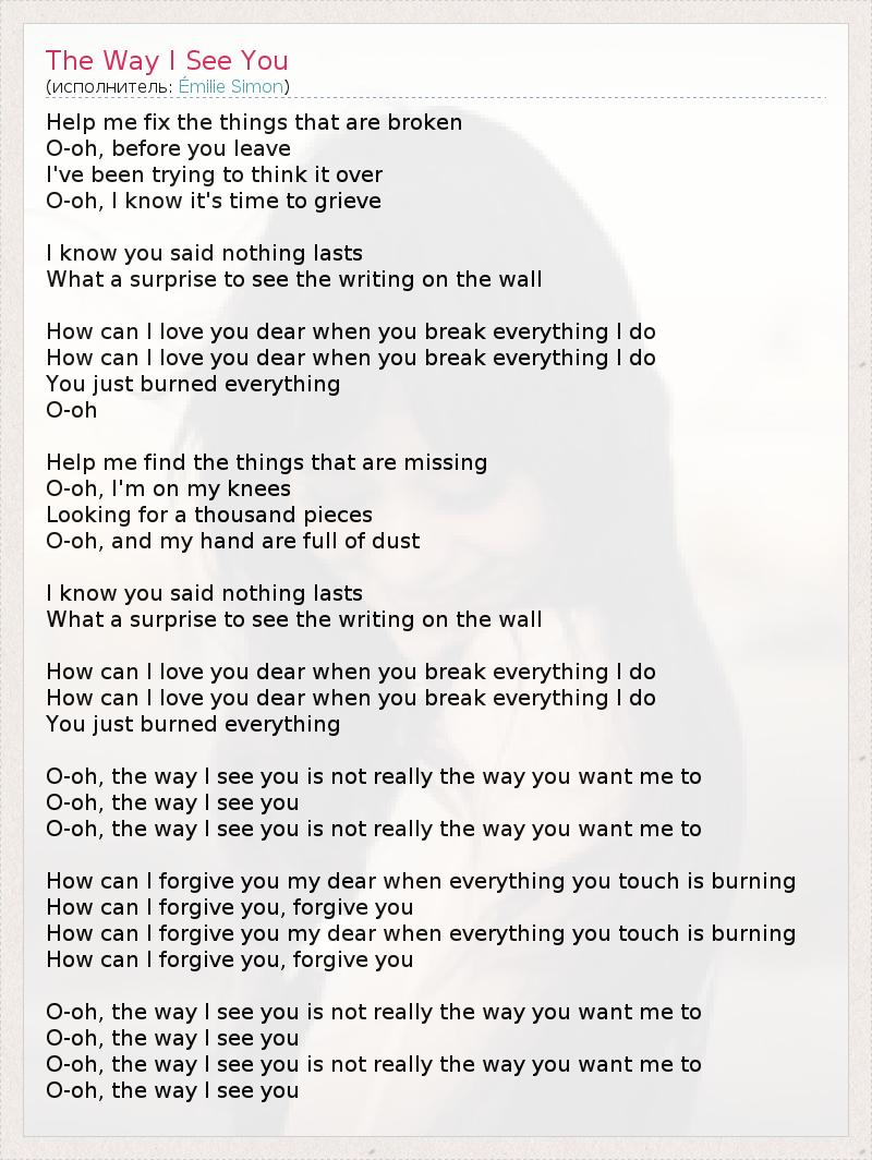 Help me fix the things that are broken O-oh, before you leave I've been trying to think it over O-oh, I know it's time to grieve I know you said nothing lasts What a surprise to see the writing on the wall How can I love you dear when you break everything I do How can I love you dear when you break everything I do You just burned everything O-oh Help me find the things that are missing O-oh, I'm on my knees Looking for a thousand pieces O-oh, and my hand are full of dust I know you said nothing lasts What a surprise to see the writing on the wall How can I love you dear when you break everything I do How can I love you dear when you break everything I do You just burned everything O-oh, the way I see you is not really the way you want me to O-oh, the way I see you O-oh, the way I see you is not really the way you want me to How can I forgive you my dear when everything you touch is burning How can I forgive you, forgive you How can I forgive you my dear when everything you touch is burning How can I forgive you, forgive you O-oh, the way I see you is not really the way you want me to O-oh, the way I see you O-oh, the way I see you is not really the way you want me to O-oh, the way I see you
