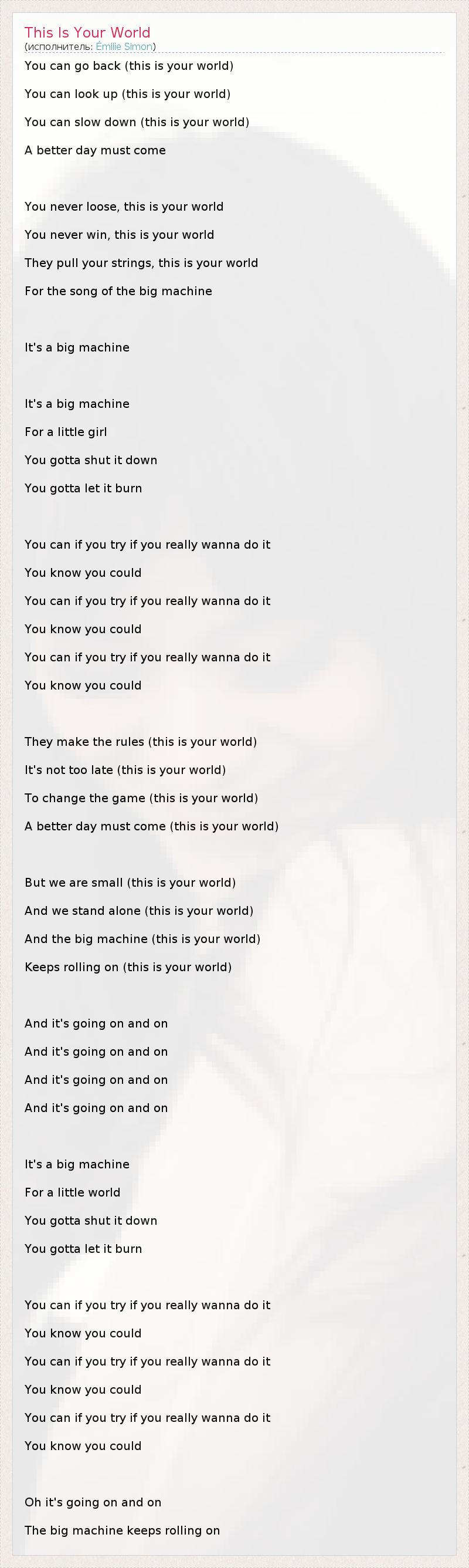 You can go back (this is your world) You can look up (this is your world) You can slow down (this is your world) A better day must come You never loose, this is your world You never win, this is your world They pull your strings, this is your world For the song of the big machine It's a big machine It's a big machine For a little girl You gotta shut it down You gotta let it burn You can if you try if you really wanna do it You know you could You can if you try if you really wanna do it You know you could You can if you try if you really wanna do it You know you could They make the rules (this is your world) It's not too late (this is your world) To change the game (this is your world) A better day must come (this is your world) But we are small (this is your world) And we stand alone (this is your world) And the big machine (this is your world) Keeps rolling on (this is your world) And it's going on and on And it's going on and on And it's going on and on And it's going on and on It's a big machine For a little world You gotta shut it down You gotta let it burn You can if you try if you really wanna do it You know you could You can if you try if you really wanna do it You know you could You can if you try if you really wanna do it You know you could Oh it's going on and on The big machine keeps rolling on