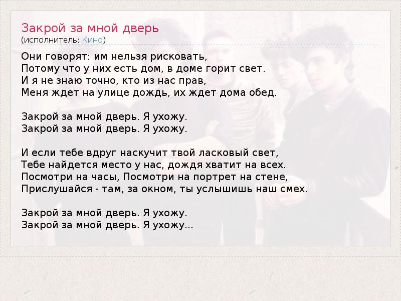 Они говорят: им нельзя рисковать, Потому что у них есть дом, в доме горит свет. И я не знаю точно, кто из нас прав, Меня ждет на улице дождь, их ждет дома обед. Закрой за мной дверь. Я ухожу. Закрой за мной дверь. Я ухожу. И если тебе вдруг наскучит твой ласковый свет, Тебе найдется место у нас, дождя хватит на всех. Посмотри на часы, Посмотри на портрет на стене, Прислушайся - там, за окном, ты услышишь наш смех. Закрой за мной дверь. Я ухожу. Закрой за мной дверь. Я ухожу...