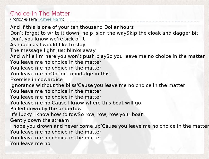 А как ты думаешь, о чем песня "Choice In The Matter" ?