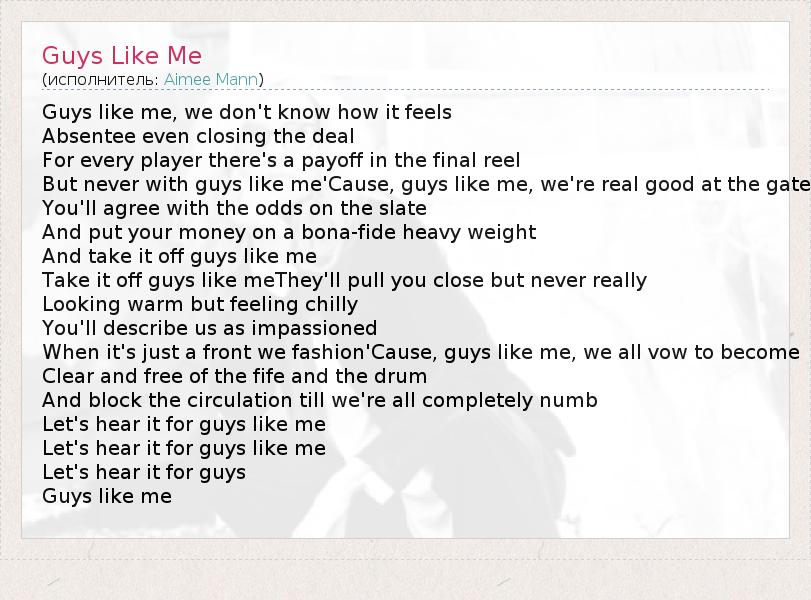 А как ты думаешь, о чем песня "Guys Like Me" ?