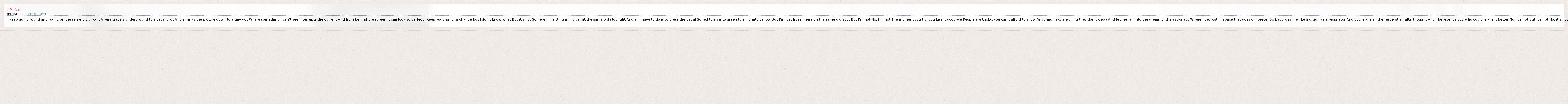 I keep going round and round on the same old circuit A wire travels underground to a vacant lot And shrinks the picture down to a tiny dot Where something I can't see interrupts the current And from behind the screen it can look so perfect I keep waiting for a change but I don't know what But it's not So here I'm sitting in my car at the same old stoplight And all I have to do is to press the pedal So red turns into green turning into yellow But I'm just frozen here on the same old spot But I'm not No, I'm not The moment you try, you kiss it goodbye People are tricky, you can't afford to show Anything risky anything they don't know And let me fall into the dream of the astronaut Where I get lost in space that goes on forever So baby kiss me like a drug like a respirator And you make all the rest just an afterthought And I believe it's you who could make it better No, it's not But it's not No, it's not