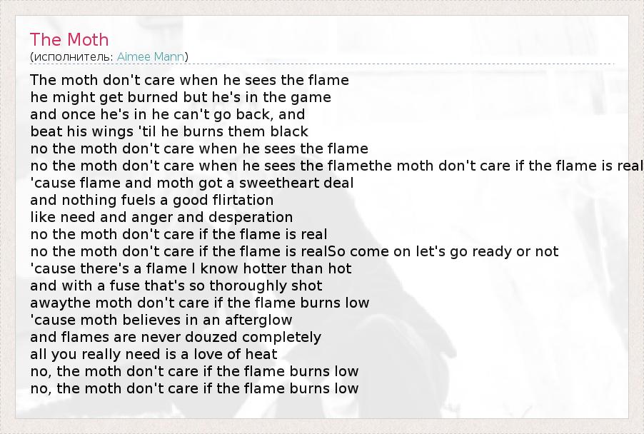 no the moth don't care when he sees the flamethe moth don't care if the flame is real