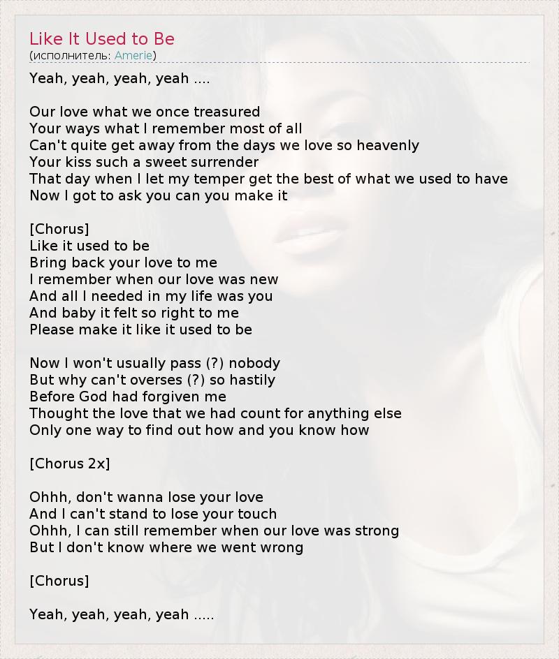Yeah, yeah, yeah, yeah .... Our love what we once treasured Your ways what I remember most of all Can't quite get away from the days we love so heavenly Your kiss such a sweet surrender That day when I let my temper get the best of what we used to have Now I got to ask you can you make it [Chorus] Like it used to be Bring back your love to me I remember when our love was new And all I needed in my life was you And baby it felt so right to me Please make it like it used to be Now I won't usually pass (?) nobody But why can't overses (?) so hastily Before God had forgiven me Thought the love that we had count for anything else Only one way to find out how and you know how [Chorus 2x] Ohhh, don't wanna lose your love And I can't stand to lose your touch Ohhh, I can still remember when our love was strong But I don't know where we went wrong [Chorus] Yeah, yeah, yeah, yeah .....