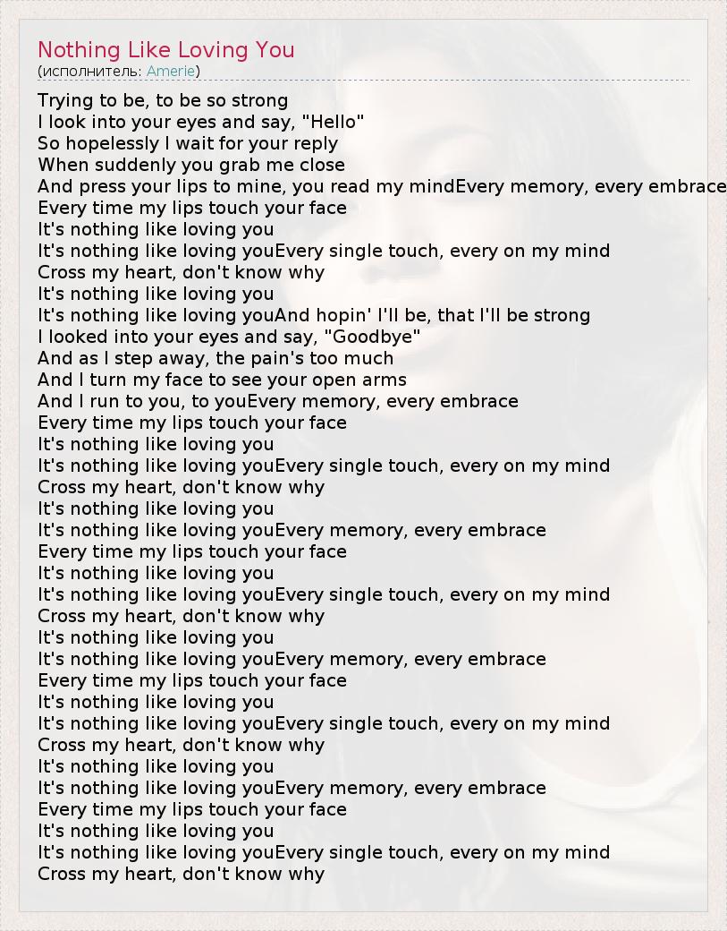 Trying to be, to be so strong I look into your eyes and say, "Hello" So hopelessly I wait for your reply When suddenly you grab me close And press your lips to mine, you read my mindEvery memory, every embrace Every time my lips touch your face It's nothing like loving you It's nothing like loving youEvery single touch, every on my mind Cross my heart, don't know why It's nothing like loving you It's nothing like loving youAnd hopin' I'll be, that I'll be strong I looked into your eyes and say, "Goodbye" And as I step away, the pain's too much And I turn my face to see your open arms And I run to you, to youEvery memory, every embrace Every time my lips touch your face It's nothing like loving you It's nothing like loving youEvery single touch, every on my mind Cross my heart, don't know why It's nothing like loving you It's nothing like loving youEvery memory, every embrace Every time my lips touch your face It's nothing like loving you It's nothing like loving youEvery single touch, every on my mind Cross my heart, don't know why It's nothing like loving you It's nothing like loving youEvery memory, every embrace Every time my lips touch your face It's nothing like loving you It's nothing like loving youEvery single touch, every on my mind Cross my heart, don't know why It's nothing like loving you It's nothing like loving youEvery memory, every embrace Every time my lips touch your face It's nothing like loving you It's nothing like loving youEvery single touch, every on my mind Cross my heart, don't know why