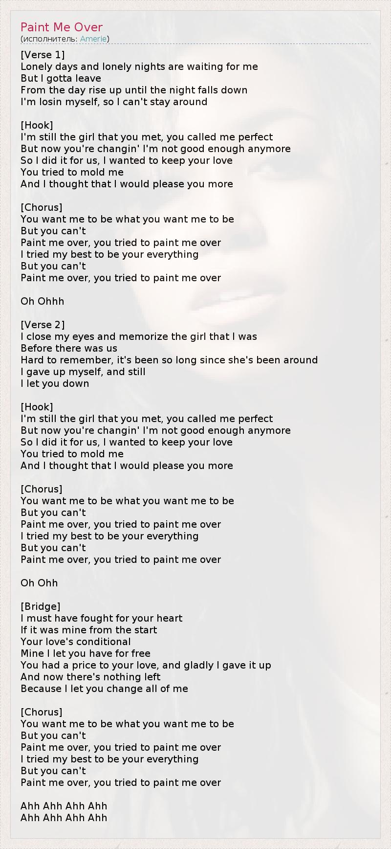 [Verse 1] Lonely days and lonely nights are waiting for me But I gotta leave From the day rise up until the night falls down I'm losin myself, so I can't stay around [Hook] I'm still the girl that you met, you called me perfect But now you're changin' I'm not good enough anymore So I did it for us, I wanted to keep your love You tried to mold me And I thought that I would please you more [Chorus] You want me to be what you want me to be But you can't Paint me over, you tried to paint me over I tried my best to be your everything But you can't Paint me over, you tried to paint me over Oh Ohhh [Verse 2] I close my eyes and memorize the girl that I was Before there was us Hard to remember, it's been so long since she's been around I gave up myself, and still I let you down [Hook] I'm still the girl that you met, you called me perfect But now you're changin' I'm not good enough anymore So I did it for us, I wanted to keep your love You tried to mold me And I thought that I would please you more [Chorus] You want me to be what you want me to be But you can't Paint me over, you tried to paint me over I tried my best to be your everything But you can't Paint me over, you tried to paint me over Oh Ohh [Bridge] I must have fought for your heart If it was mine from the start Your love's conditional Mine I let you have for free You had a price to your love, and gladly I gave it up And now there's nothing left Because I let you change all of me [Chorus] You want me to be what you want me to be But you can't Paint me over, you tried to paint me over I tried my best to be your everything But you can't Paint me over, you tried to paint me over Ahh Ahh Ahh Ahh Ahh Ahh Ahh Ahh