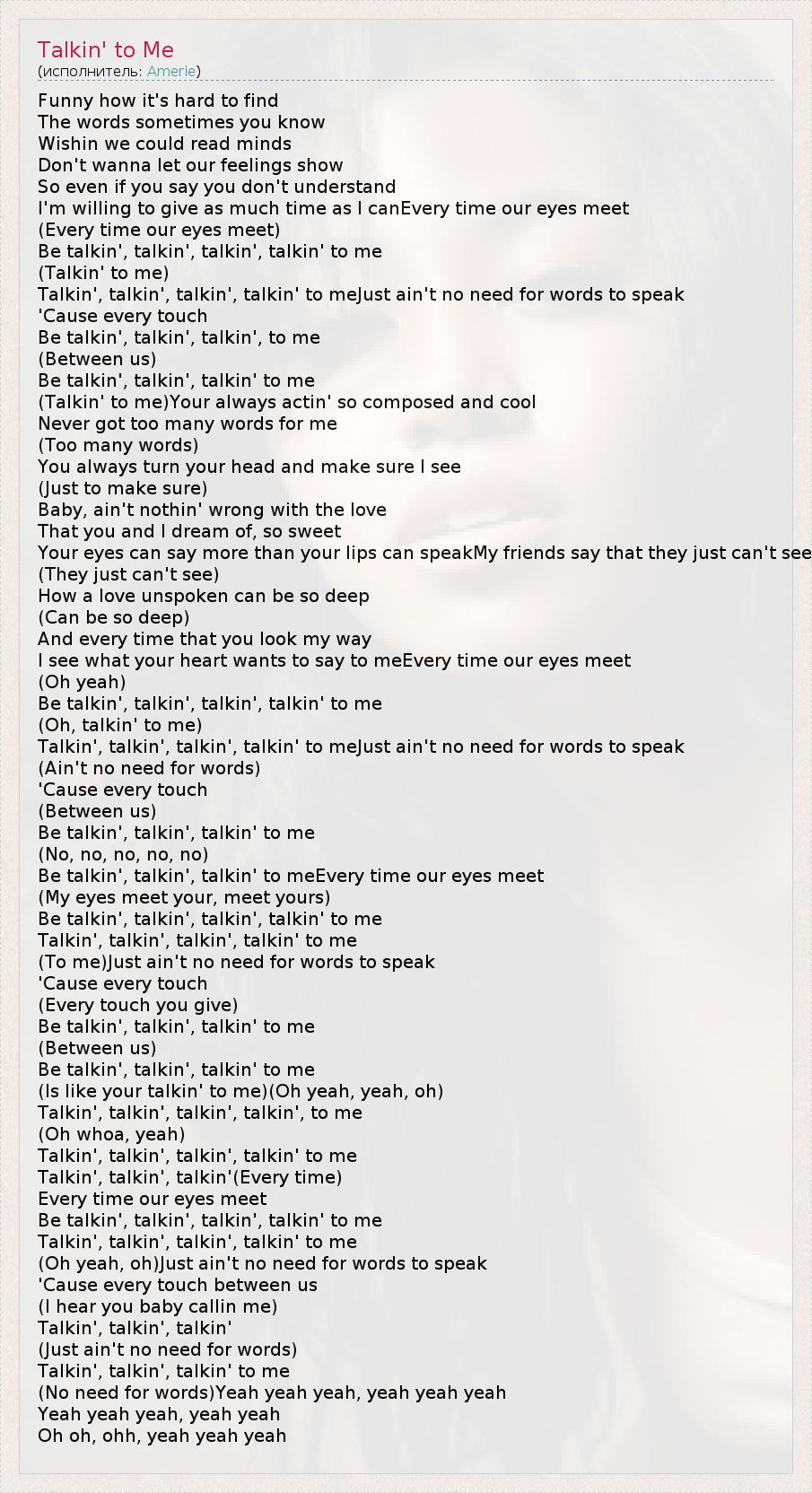 Funny how it's hard to find The words sometimes you know Wishin we could read minds Don't wanna let our feelings show So even if you say you don't understand I'm willing to give as much time as I canEvery time our eyes meet (Every time our eyes meet) Be talkin', talkin', talkin', talkin' to me (Talkin' to me) Talkin', talkin', talkin', talkin' to meJust ain't no need for words to speak 'Cause every touch Be talkin', talkin', talkin', to me (Between us) Be talkin', talkin', talkin' to me (Talkin' to me)Your always actin' so composed and cool Never got too many words for me (Too many words) You always turn your head and make sure I see (Just to make sure) Baby, ain't nothin' wrong with the love That you and I dream of, so sweet Your eyes can say more than your lips can speakMy friends say that they just can't see (They just can't see) How a love unspoken can be so deep (Can be so deep) And every time that you look my way I see what your heart wants to say to meEvery time our eyes meet (Oh yeah) Be talkin', talkin', talkin', talkin' to me (Oh, talkin' to me) Talkin', talkin', talkin', talkin' to meJust ain't no need for words to speak (Ain't no need for words) 'Cause every touch (Between us) Be talkin', talkin', talkin' to me (No, no, no, no, no) Be talkin', talkin', talkin' to meEvery time our eyes meet (My eyes meet your, meet yours) Be talkin', talkin', talkin', talkin' to me Talkin', talkin', talkin', talkin' to me (To me)Just ain't no need for words to speak 'Cause every touch (Every touch you give) Be talkin', talkin', talkin' to me (Between us) Be talkin', talkin', talkin' to me (Is like your talkin' to me)(Oh yeah, yeah, oh) Talkin', talkin', talkin', talkin', to me (Oh whoa, yeah) Talkin', talkin', talkin', talkin' to me Talkin', talkin', talkin'(Every time) Every time our eyes meet Be talkin', talkin', talkin', talkin' to me Talkin', talkin', talkin', talkin' to me (Oh yeah, oh)Just ain't no need for words to speak 'Cause every touch between us (I hear you baby callin me) Talkin', talkin', talkin' (Just ain't no need for words) Talkin', talkin', talkin' to me (No need for words)Yeah yeah yeah, yeah yeah yeah Yeah yeah yeah, yeah yeah Oh oh, ohh, yeah yeah yeah