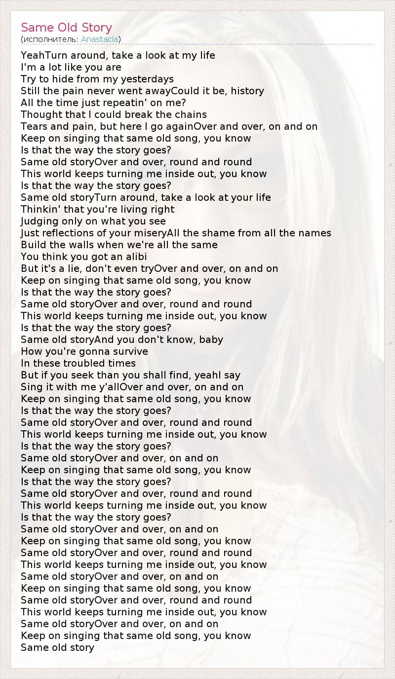 YeahTurn around, take a look at my life I'm a lot like you are Try to hide from my yesterdays Still the pain never went awayCould it be, history All the time just repeatin' on me? Thought that I could break the chains Tears and pain, but here I go againOver and over, on and on Keep on singing that same old song, you know Is that the way the story goes? Same old storyOver and over, round and round This world keeps turning me inside out, you know Is that the way the story goes? Same old storyTurn around, take a look at your life Thinkin' that you're living right Judging only on what you see Just reflections of your miseryAll the shame from all the names Build the walls when we're all the same You think you got an alibi But it's a lie, don't even tryOver and over, on and on Keep on singing that same old song, you know Is that the way the story goes? Same old storyOver and over, round and round This world keeps turning me inside out, you know Is that the way the story goes? Same old storyAnd you don't know, baby How you're gonna survive In these troubled times But if you seek than you shall find, yeahI say Sing it with me y'allOver and over, on and on Keep on singing that same old song, you know Is that the way the story goes? Same old storyOver and over, round and round This world keeps turning me inside out, you know Is that the way the story goes? Same old storyOver and over, on and on Keep on singing that same old song, you know Is that the way the story goes? Same old storyOver and over, round and round This world keeps turning me inside out, you know Is that the way the story goes? Same old storyOver and over, on and on Keep on singing that same old song, you know Same old storyOver and over, round and round This world keeps turning me inside out, you know Same old storyOver and over, on and on Keep on singing that same old song, you know Same old storyOver and over, round and round This world keeps turning me inside out, you know Same old storyOver and over, on and on Keep on singing that same old song, you know Same old story