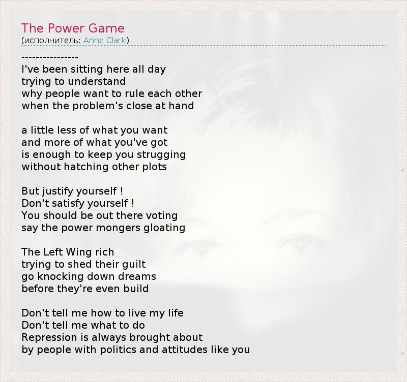 ---------------- I've been sitting here all day trying to understand why people want to rule each other when the problem's close at hand a little less of what you want and more of what you've got is enough to keep you strugging without hatching other plots But justify yourself ! Don't satisfy yourself ! You should be out there voting say the power mongers gloating The Left Wing rich trying to shed their guilt go knocking down dreams before they're even build Don't tell me how to live my life Don't tell me what to do Repression is always brought about by people with politics and attitudes like you