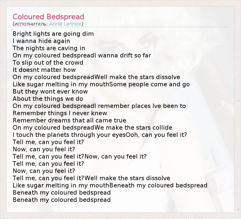 Bright lights are going dim I wanna hide again The nights are caving in On my coloured bedspreadI wanna drift so far To slip out of the crowd It doesnt matter how On my coloured bedspreadWell make the stars dissolve Like sugar melting in my mouthSome people come and go But they wont ever know About the things we do On my coloured bedspreadI remember places Ive been to Remember things I never knew Remember dreams that all came true On my coloured bedspreadWe make the stars collide I touch the planets through your eyesOoh, can you feel it? Tell me, can you feel it? Now, can you feel it? Tell me, can you feel it?Now, can you feel it? Tell me, can you feel it? Now, can you feel it? Tell me, can you feel it?Well make the stars dissolve Like sugar melting in my mouthBeneath my coloured bedspread Beneath my coloured bedspread Beneath my coloured bedspread