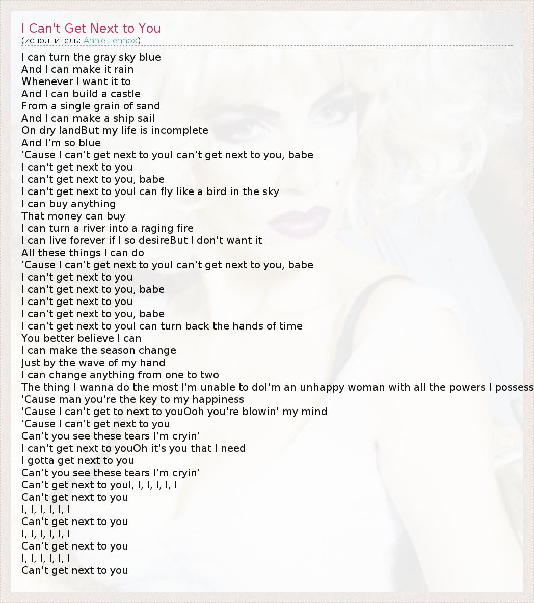 I can turn the gray sky blue And I can make it rain Whenever I want it to And I can build a castle From a single grain of sand And I can make a ship sail On dry landBut my life is incomplete And I'm so blue 'Cause I can't get next to youI can't get next to you, babe I can't get next to you I can't get next to you, babe I can't get next to youI can fly like a bird in the sky I can buy anything That money can buy I can turn a river into a raging fire I can live forever if I so desireBut I don't want it All these things I can do 'Cause I can't get next to youI can't get next to you, babe I can't get next to you I can't get next to you, babe I can't get next to you I can't get next to you, babe I can't get next to youI can turn back the hands of time You better believe I can I can make the season change Just by the wave of my hand I can change anything from one to two The thing I wanna do the most I'm unable to doI'm an unhappy woman with all the powers I possess 'Cause man you're the key to my happiness 'Cause I can't get to next to youOoh you're blowin' my mind 'Cause I can't get next to you Can't you see these tears I'm cryin' I can't get next to youOh it's you that I need I gotta get next to you Can't you see these tears I'm cryin' Can't get next to youI, I, I, I, I, I Can't get next to you I, I, I, I, I, I Can't get next to you I, I, I, I, I, I Can't get next to you I, I, I, I, I, I Can't get next to you