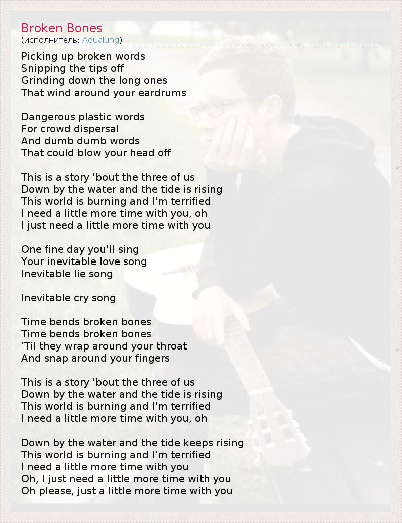 Picking up broken words Snipping the tips off Grinding down the long ones That wind around your eardrums Dangerous plastic words For crowd dispersal And dumb dumb words That could blow your head off This is a story 'bout the three of us Down by the water and the tide is rising This world is burning and I'm terrified I need a little more time with you, oh I just need a little more time with you One fine day you'll sing Your inevitable love song Inevitable lie song Inevitable cry song Time bends broken bones Time bends broken bones 'Til they wrap around your throat And snap around your fingers This is a story 'bout the three of us Down by the water and the tide is rising This world is burning and I'm terrified I need a little more time with you, oh Down by the water and the tide keeps rising This world is burning and I'm terrified I need a little more time with you Oh, I just need a little more time with you Oh please, just a little more time with you