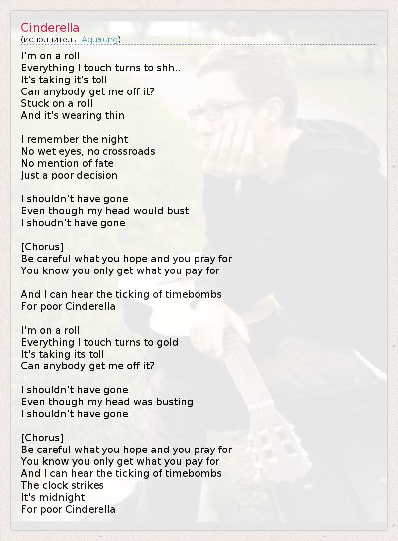 I'm on a roll Everything I touch turns to shh.. It's taking it's toll Can anybody get me off it? Stuck on a roll And it's wearing thin I remember the night No wet eyes, no crossroads No mention of fate Just a poor decision I shouldn't have gone Even though my head would bust I shoudn't have gone [Chorus] Be careful what you hope and you pray for You know you only get what you pay for And I can hear the ticking of timebombs For poor Cinderella I'm on a roll Everything I touch turns to gold It's taking its toll Can anybody get me off it? I shouldn't have gone Even though my head was busting I shouldn't have gone [Chorus] Be careful what you hope and you pray for You know you only get what you pay for And I can hear the ticking of timebombs The clock strikes It's midnight For poor Cinderella