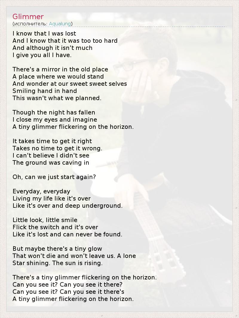 I know that I was lost And I know that it was too too hard And although it isn't much I give you all I have. There's a mirror in the old place A place where we would stand And wonder at our sweet sweet selves Smiling hand in hand This wasn't what we planned. Though the night has fallen I close my eyes and imagine A tiny glimmer flickering on the horizon. It takes time to get it right Takes no time to get it wrong. I can't believe I didn't see The ground was caving in Oh, can we just start again? Everyday, everyday Living my life like it's over Like it's over and deep underground. Little look, little smile Flick the switch and it's over Like it's lost and can never be found. But maybe there's a tiny glow That won't die and won't leave us. A lone Star shining. The sun is rising. There's a tiny glimmer flickering on the horizon. Can you see it? Can you see it there? Can you see it? Can you see it there's A tiny glimmer flickering on the horizon.