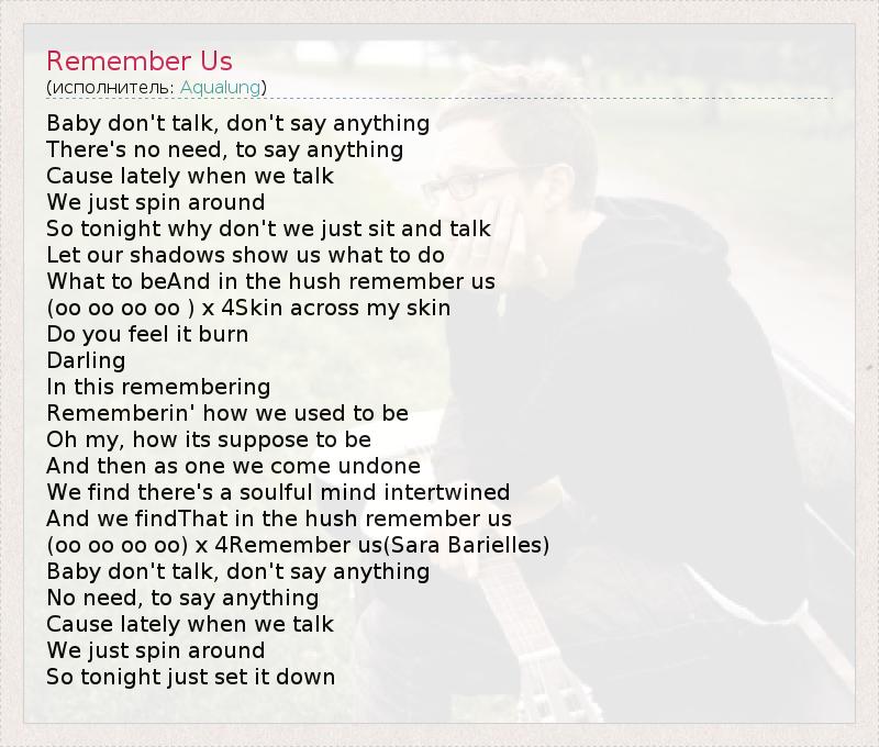 Baby don't talk, don't say anything There's no need, to say anything Cause lately when we talk We just spin around So tonight why don't we just sit and talk Let our shadows show us what to do What to beAnd in the hush remember us (oo oo oo oo ) x 4Skin across my skin Do you feel it burn Darling In this remembering Rememberin' how we used to be Oh my, how its suppose to be And then as one we come undone We find there's a soulful mind intertwined And we findThat in the hush remember us (oo oo oo oo) x 4Remember us(Sara Barielles) Baby don't talk, don't say anything No need, to say anything Cause lately when we talk We just spin around So tonight just set it down