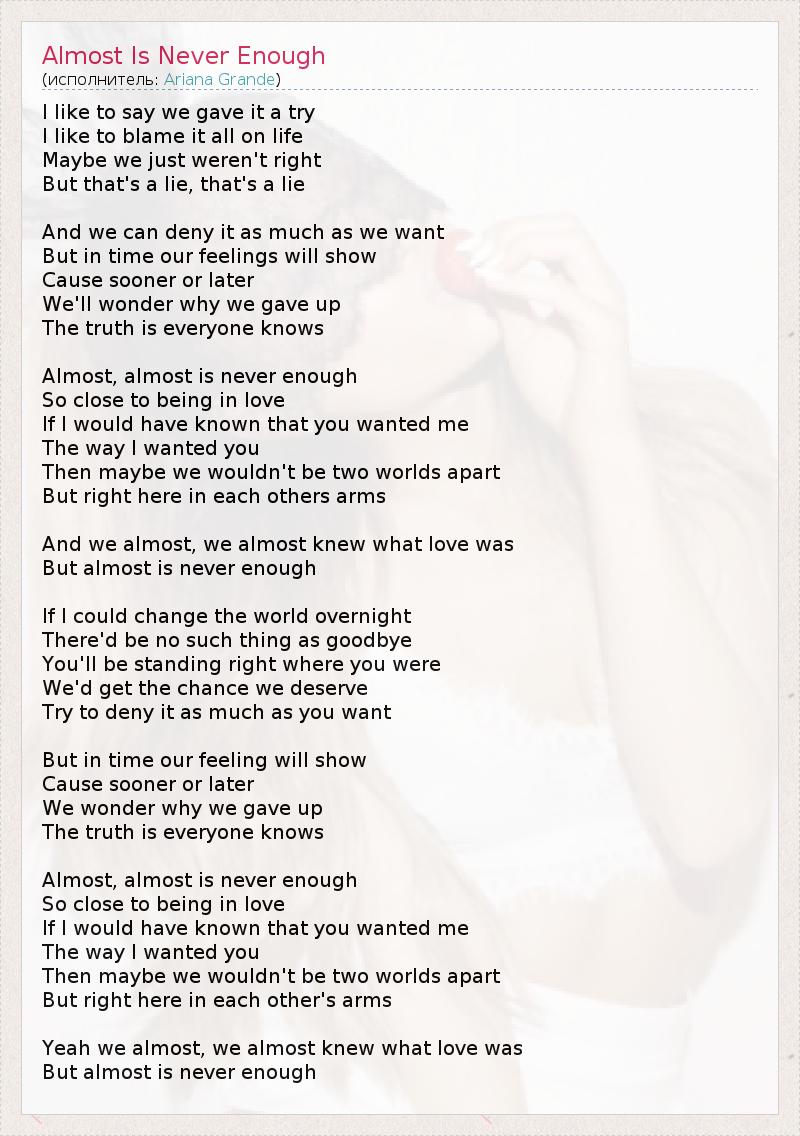 А как ты думаешь, о чем песня "Almost Is Never Enough" ?