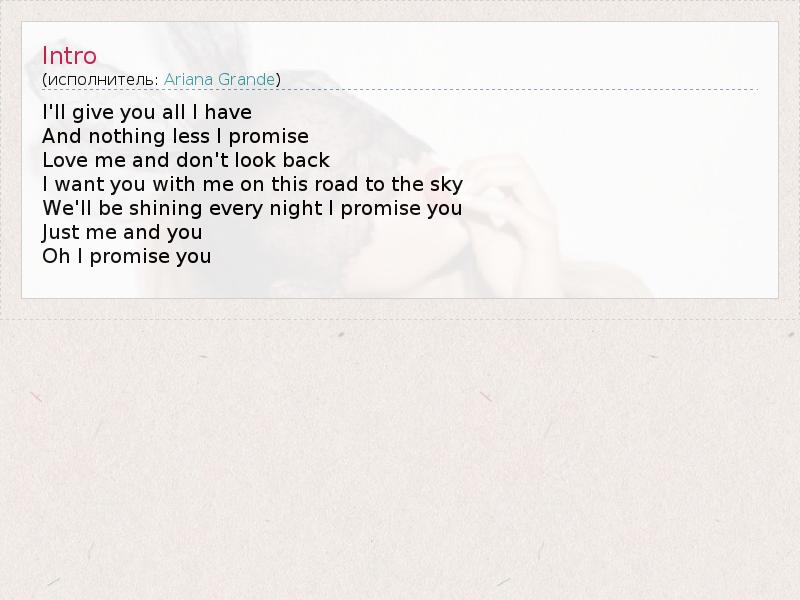 I'll give you all I have And nothing less I promise Love me and don't look back I want you with me on this road to the sky We'll be shining every night I promise you Just me and you Oh I promise you