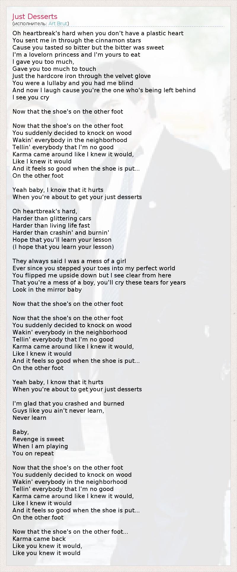 Oh heartbreak's hard when you don't have a plastic heart You sent me in through the cinnamon stars Cause you tasted so bitter but the bitter was sweet I'm a lovelorn princess and I'm yours to eat I gave you too much, Gave you too much to touch Just the hardcore iron through the velvet glove You were a lullaby and you had me blind And now I laugh cause you're the one who's being left behind I see you cry Now that the shoe's on the other foot Now that the shoe's on the other foot You suddenly decided to knock on wood Wakin' everybody in the neighborhood Tellin' everybody that I'm no good Karma came around like I knew it would, Like I knew it would And it feels so good when the shoe is put... On the other foot Yeah baby, I know that it hurts When you're about to get your just desserts Oh heartbreak's hard, Harder than glittering cars Harder than living life fast Harder than crashin' and burnin' Hope that you'll learn your lesson (I hope that you learn your lesson) They always said I was a mess of a girl Ever since you stepped your toes into my perfect world You flipped me upside down but I see clear from here That you're a mess of a boy, you'll cry these tears for years Look in the mirror baby Now that the shoe's on the other foot Now that the shoe's on the other foot You suddenly decided to knock on wood Wakin' everybody in the neighborhood Tellin' everybody that I'm no good Karma came around like I knew it would, Like I knew it would And it feels so good when the shoe is put... On the other foot Yeah baby, I know that it hurts When you're about to get your just desserts I'm glad that you crashed and burned Guys like you ain't never learn, Never learn Baby, Revenge is sweet When I am playing You on repeat Now that the shoe's on the other foot You suddenly decided to knock on wood Wakin' everybody in the neighborhood Tellin' everybody that I'm no good Karma came around like I knew it would, Like I knew it would And it feels so good when the shoe is put... On the other foot Now that the shoe's on the other foot... Karma came back Like you knew it would, Like you knew it would
