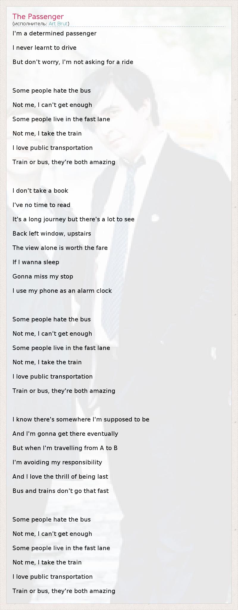 I'm a determined passenger I never learnt to drive But don't worry, I'm not asking for a ride Some people hate the bus Not me, I can't get enough Some people live in the fast lane Not me, I take the train I love public transportation Train or bus, they're both amazing I don't take a book I've no time to read It's a long journey but there's a lot to see Back left window, upstairs The view alone is worth the fare If I wanna sleep Gonna miss my stop I use my phone as an alarm clock Some people hate the bus Not me, I can't get enough Some people live in the fast lane Not me, I take the train I love public transportation Train or bus, they're both amazing I know there's somewhere I'm supposed to be And I'm gonna get there eventually But when I'm travelling from A to B I'm avoiding my responsibility And I love the thrill of being last Bus and trains don't go that fast Some people hate the bus Not me, I can't get enough Some people live in the fast lane Not me, I take the train I love public transportation Train or bus, they're both amazing