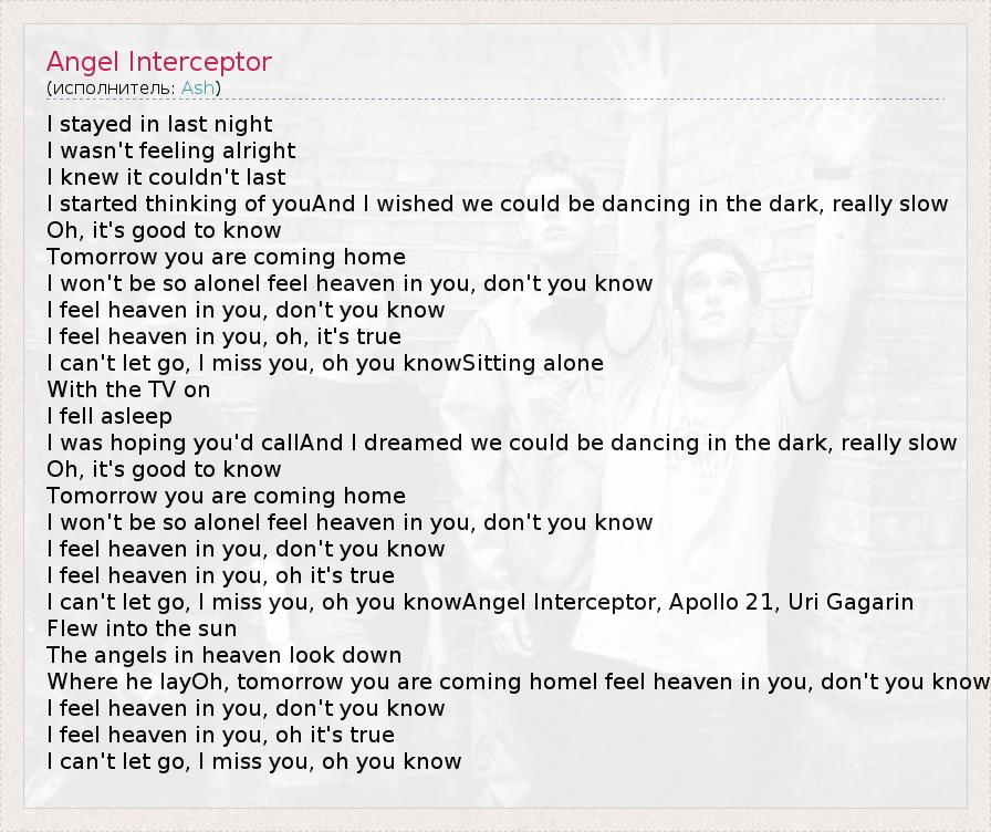 I can't let go, I miss you, oh you knowAngel Interceptor, Apollo 21, Uri Gagarin
