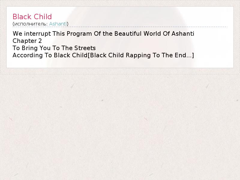 Это интересно:Прекрасная певица, великолепная танцовщица Ashanti Douglas появилась на свет в 1980 году в далеко не престижном районе — Glen Cove, Long Island в New York. Росла она в семье музыкантов. Её отец был певцом, а мать инструктором по танцам. Уже в возрасте 6 лет Ashanti начала петь в церковном хоре. Вместе с тем, как взрослела сама певица, с ней рос и её талант. Медоточивый голос и экзотическая внешность обеспечили певице... продолжение
