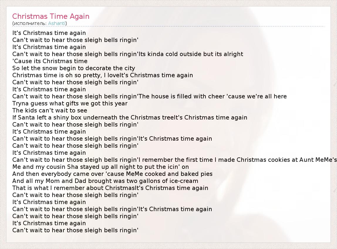 It's Christmas time again Can't wait to hear those sleigh bells ringin' It's Christmas time again Can't wait to hear those sleigh bells ringin'Its kinda cold outside but its alright 'Cause its Christmas time So let the snow begin to decorate the city Christmas time is oh so pretty, I loveIt's Christmas time again Can't wait to hear those sleigh bells ringin' It's Christmas time again Can't wait to hear those sleigh bells ringin'The house is filled with cheer 'cause we're all here Tryna guess what gifts we got this year The kids can't wait to see If Santa left a shiny box underneath the Christmas treeIt's Christmas time again Can't wait to hear those sleigh bells ringin' It's Christmas time again Can't wait to hear those sleigh bells ringin'It's Christmas time again Can't wait to hear those sleigh bells ringin' It's Christmas time again Can't wait to hear those sleigh bells ringin'I remember the first time I made Christmas cookies at Aunt MeMe's Me and my cousin Sha stayed up all night to put the icin' on And then everybody came over 'cause MeMe cooked and baked pies And all my Mom and Dad brought was two gallons of ice-cream That is what I remember about ChristmasIt's Christmas time again Can't wait to hear those sleigh bells ringin' It's Christmas time again Can't wait to hear those sleigh bells ringin'It's Christmas time again Can't wait to hear those sleigh bells ringin' It's Christmas time again Can't wait to hear those sleigh bells ringin'