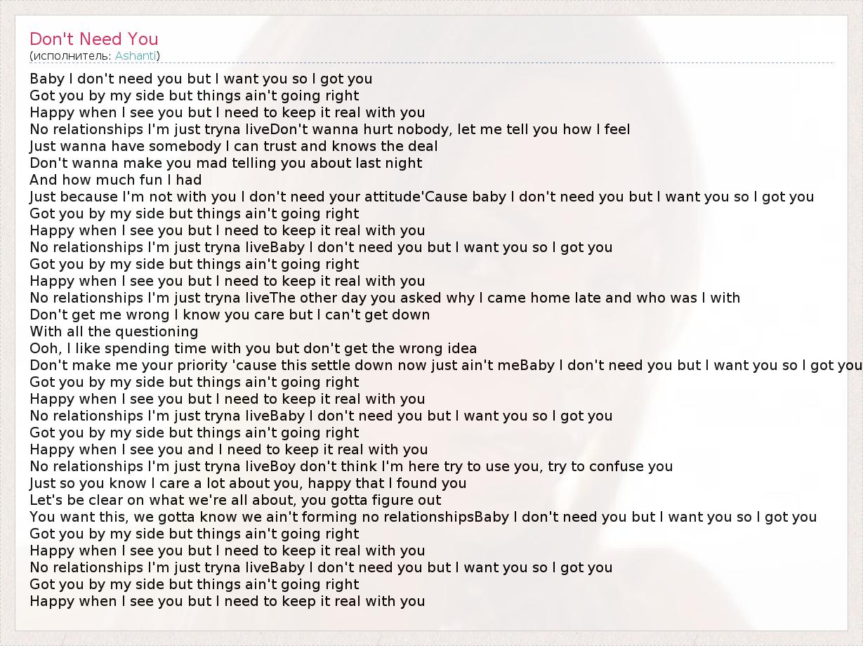 Just because I'm not with you I don't need your attitude'Cause baby I don't need you but I want you so I got you