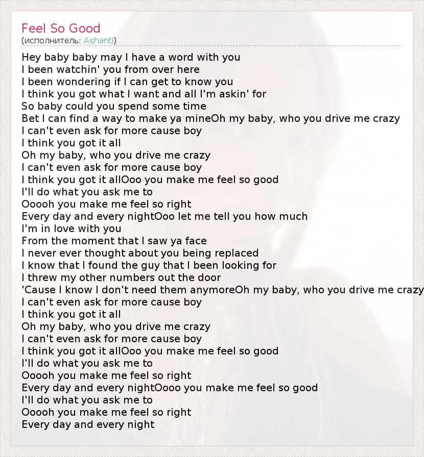 Hey baby baby may I have a word with you I been watchin' you from over here I been wondering if I can get to know you I think you got what I want and all I'm askin' for So baby could you spend some time Bet I can find a way to make ya mineOh my baby, who you drive me crazy I can't even ask for more cause boy I think you got it all Oh my baby, who you drive me crazy I can't even ask for more cause boy I think you got it allOoo you make me feel so good I'll do what you ask me to Ooooh you make me feel so right Every day and every nightOoo let me tell you how much I'm in love with you From the moment that I saw ya face I never ever thought about you being replaced I know that I found the guy that I been looking for I threw my other numbers out the door 'Cause I know I don't need them anymoreOh my baby, who you drive me crazy I can't even ask for more cause boy I think you got it all Oh my baby, who you drive me crazy I can't even ask for more cause boy I think you got it allOoo you make me feel so good I'll do what you ask me to Ooooh you make me feel so right Every day and every nightOooo you make me feel so good I'll do what you ask me to Ooooh you make me feel so right Every day and every night