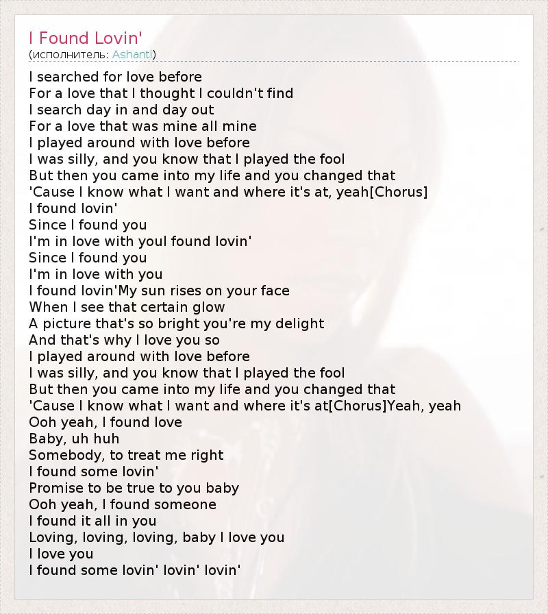 I searched for love before For a love that I thought I couldn't find I search day in and day out For a love that was mine all mine I played around with love before I was silly, and you know that I played the fool But then you came into my life and you changed that 'Cause I know what I want and where it's at, yeah[Chorus] I found lovin' Since I found you I'm in love with youI found lovin' Since I found you I'm in love with you I found lovin'My sun rises on your face When I see that certain glow A picture that's so bright you're my delight And that's why I love you so I played around with love before I was silly, and you know that I played the fool But then you came into my life and you changed that 'Cause I know what I want and where it's at[Chorus]Yeah, yeah Ooh yeah, I found love Baby, uh huh Somebody, to treat me right I found some lovin' Promise to be true to you baby Ooh yeah, I found someone I found it all in you Loving, loving, loving, baby I love you I love you I found some lovin' lovin' lovin'