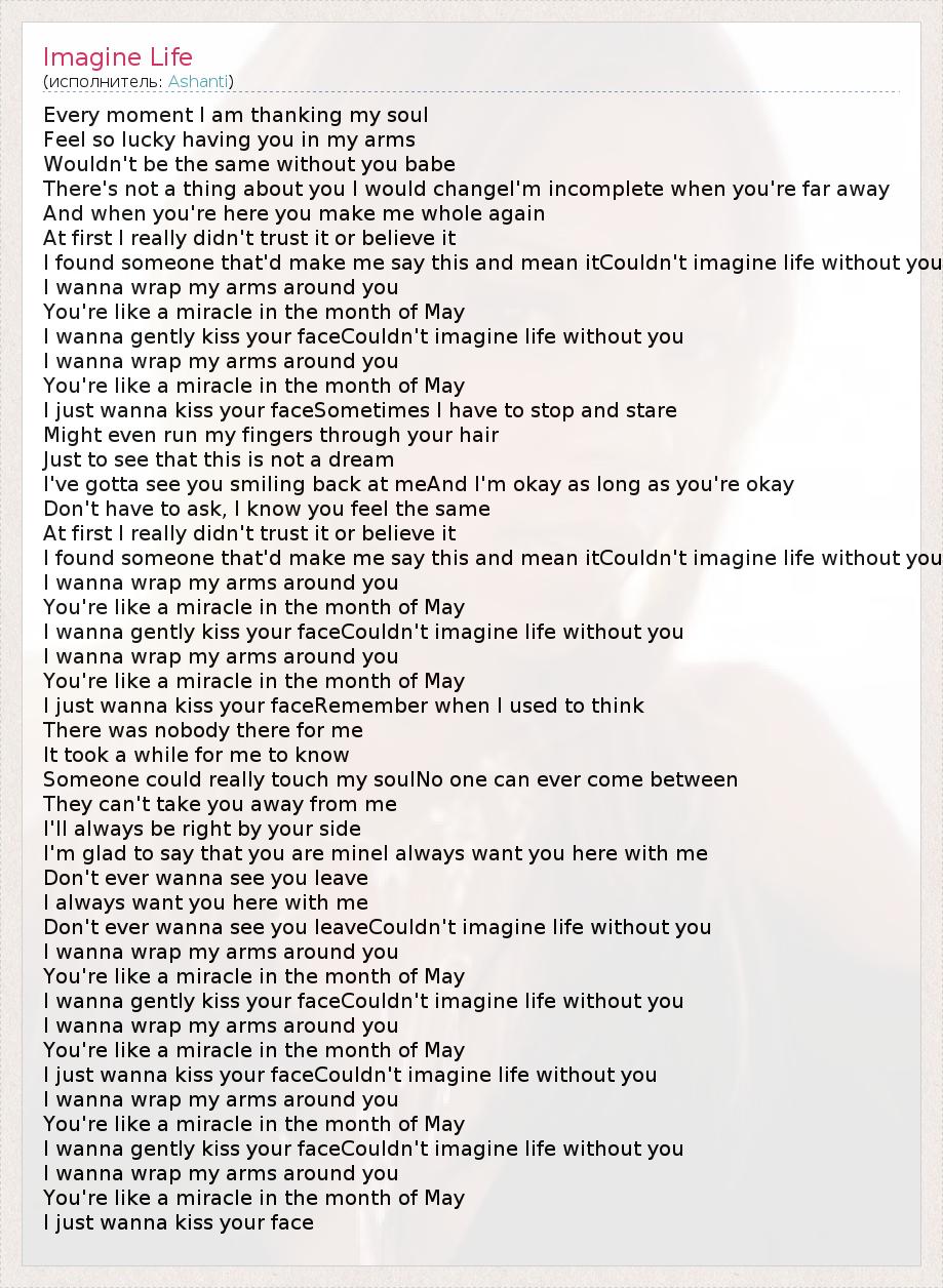 Every moment I am thanking my soul Feel so lucky having you in my arms Wouldn't be the same without you babe There's not a thing about you I would changeI'm incomplete when you're far away And when you're here you make me whole again At first I really didn't trust it or believe it I found someone that'd make me say this and mean itCouldn't imagine life without you I wanna wrap my arms around you You're like a miracle in the month of May I wanna gently kiss your faceCouldn't imagine life without you I wanna wrap my arms around you You're like a miracle in the month of May I just wanna kiss your faceSometimes I have to stop and stare Might even run my fingers through your hair Just to see that this is not a dream I've gotta see you smiling back at meAnd I'm okay as long as you're okay Don't have to ask, I know you feel the same At first I really didn't trust it or believe it I found someone that'd make me say this and mean itCouldn't imagine life without you I wanna wrap my arms around you You're like a miracle in the month of May I wanna gently kiss your faceCouldn't imagine life without you I wanna wrap my arms around you You're like a miracle in the month of May I just wanna kiss your faceRemember when I used to think There was nobody there for me It took a while for me to know Someone could really touch my soulNo one can ever come between They can't take you away from me I'll always be right by your side I'm glad to say that you are mineI always want you here with me Don't ever wanna see you leave I always want you here with me Don't ever wanna see you leaveCouldn't imagine life without you I wanna wrap my arms around you You're like a miracle in the month of May I wanna gently kiss your faceCouldn't imagine life without you I wanna wrap my arms around you You're like a miracle in the month of May I just wanna kiss your faceCouldn't imagine life without you I wanna wrap my arms around you You're like a miracle in the month of May I wanna gently kiss your faceCouldn't imagine life without you I wanna wrap my arms around you You're like a miracle in the month of May I just wanna kiss your face