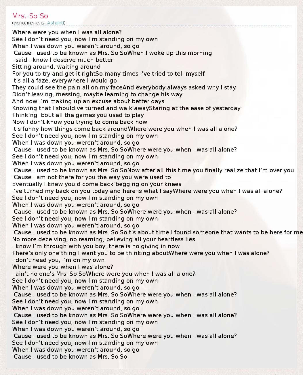 'Cause I used to be known as Mrs. So SoWhere were you when I was all alone?
