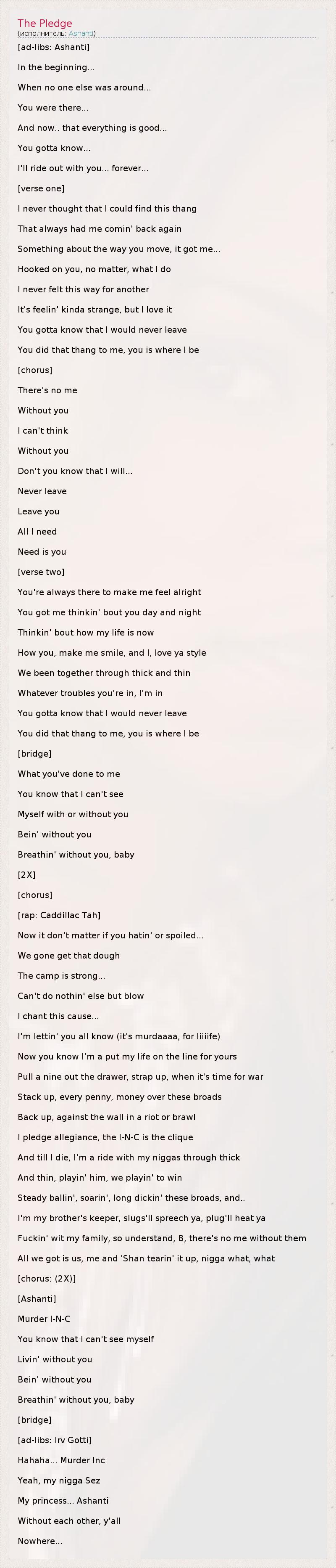 [ad-libs: Ashanti] In the beginning... When no one else was around... You were there... And now.. that everything is good... You gotta know... I'll ride out with you... forever... [verse one] I never thought that I could find this thang That always had me comin' back again Something about the way you move, it got me... Hooked on you, no matter, what I do I never felt this way for another It's feelin' kinda strange, but I love it You gotta know that I would never leave You did that thang to me, you is where I be [chorus] There's no me Without you I can't think Without you Don't you know that I will... Never leave Leave you All I need Need is you [verse two] You're always there to make me feel alright You got me thinkin' bout you day and night Thinkin' bout how my life is now How you, make me smile, and I, love ya style We been together through thick and thin Whatever troubles you're in, I'm in You gotta know that I would never leave You did that thang to me, you is where I be [bridge] What you've done to me You know that I can't see Myself with or without you Bein' without you Breathin' without you, baby [2X] [chorus] [rap: Caddillac Tah] Now it don't matter if you hatin' or spoiled... We gone get that dough The camp is strong... Can't do nothin' else but blow I chant this cause... I'm lettin' you all know (it's murdaaaa, for liiiife) Now you know I'm a put my life on the line for yours Pull a nine out the drawer, strap up, when it's time for war Stack up, every penny, money over these broads Back up, against the wall in a riot or brawl I pledge allegiance, the I-N-C is the clique And till I die, I'm a ride with my niggas through thick And thin, playin' him, we playin' to win Steady ballin', soarin', long dickin' these broads, and.. I'm my brother's keeper, slugs'll spreech ya, plug'll heat ya Fuckin' wit my family, so understand, B, there's no me without them All we got is us, me and 'Shan tearin' it up, nigga what, what [chorus: (2X)] [Ashanti] Murder I-N-C You know that I can't see myself Livin' without you Bein' without you Breathin' without you, baby [bridge] [ad-libs: Irv Gotti] Hahaha... Murder Inc Yeah, my nigga Sez My princess... Ashanti Without each other, y'all Nowhere...