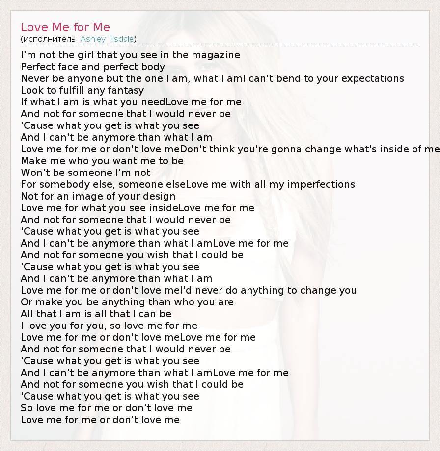 I'm not the girl that you see in the magazine Perfect face and perfect body Never be anyone but the one I am, what I amI can't bend to your expectations Look to fulfill any fantasy If what I am is what you needLove me for me And not for someone that I would never be 'Cause what you get is what you see And I can't be anymore than what I am Love me for me or don't love meDon't think you're gonna change what's inside of me Make me who you want me to be Won't be someone I'm not For somebody else, someone elseLove me with all my imperfections Not for an image of your design Love me for what you see insideLove me for me And not for someone that I would never be 'Cause what you get is what you see And I can't be anymore than what I amLove me for me And not for someone you wish that I could be 'Cause what you get is what you see And I can't be anymore than what I am Love me for me or don't love meI'd never do anything to change you Or make you be anything than who you are All that I am is all that I can be I love you for you, so love me for me Love me for me or don't love meLove me for me And not for someone that I would never be 'Cause what you get is what you see And I can't be anymore than what I amLove me for me And not for someone you wish that I could be 'Cause what you get is what you see So love me for me or don't love me Love me for me or don't love me