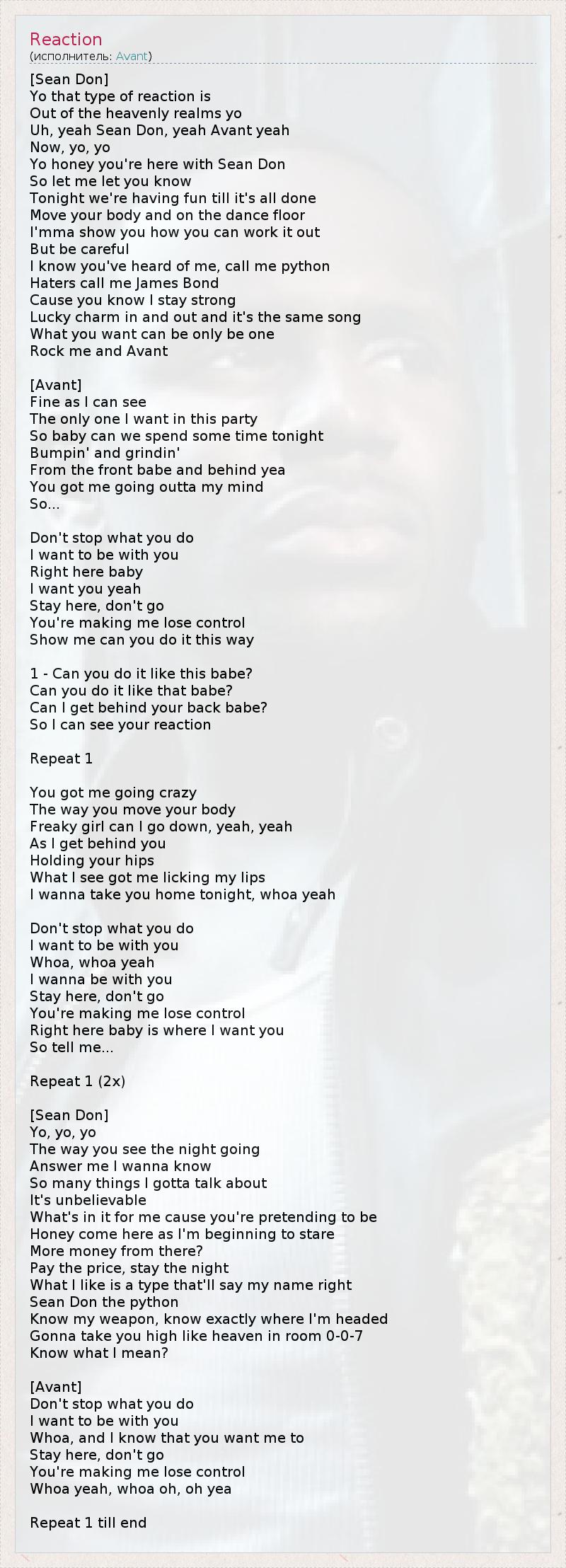 [Sean Don] Yo that type of reaction is Out of the heavenly realms yo Uh, yeah Sean Don, yeah Avant yeah Now, yo, yo Yo honey you're here with Sean Don So let me let you know Tonight we're having fun till it's all done Move your body and on the dance floor I'mma show you how you can work it out But be careful I know you've heard of me, call me python Haters call me James Bond Cause you know I stay strong Lucky charm in and out and it's the same song What you want can be only be one Rock me and Avant [Avant] Fine as I can see The only one I want in this party So baby can we spend some time tonight Bumpin' and grindin' From the front babe and behind yea You got me going outta my mind So... Don't stop what you do I want to be with you Right here baby I want you yeah Stay here, don't go You're making me lose control Show me can you do it this way 1 - Can you do it like this babe? Can you do it like that babe? Can I get behind your back babe? So I can see your reaction Repeat 1 You got me going crazy The way you move your body Freaky girl can I go down, yeah, yeah As I get behind you Holding your hips What I see got me licking my lips I wanna take you home tonight, whoa yeah Don't stop what you do I want to be with you Whoa, whoa yeah I wanna be with you Stay here, don't go You're making me lose control Right here baby is where I want you So tell me... Repeat 1 (2x) [Sean Don] Yo, yo, yo The way you see the night going Answer me I wanna know So many things I gotta talk about It's unbelievable What's in it for me cause you're pretending to be Honey come here as I'm beginning to stare More money from there? Pay the price, stay the night What I like is a type that'll say my name right Sean Don the python Know my weapon, know exactly where I'm headed Gonna take you high like heaven in room 0-0-7 Know what I mean? [Avant] Don't stop what you do I want to be with you Whoa, and I know that you want me to Stay here, don't go You're making me lose control Whoa yeah, whoa oh, oh yea Repeat 1 till end