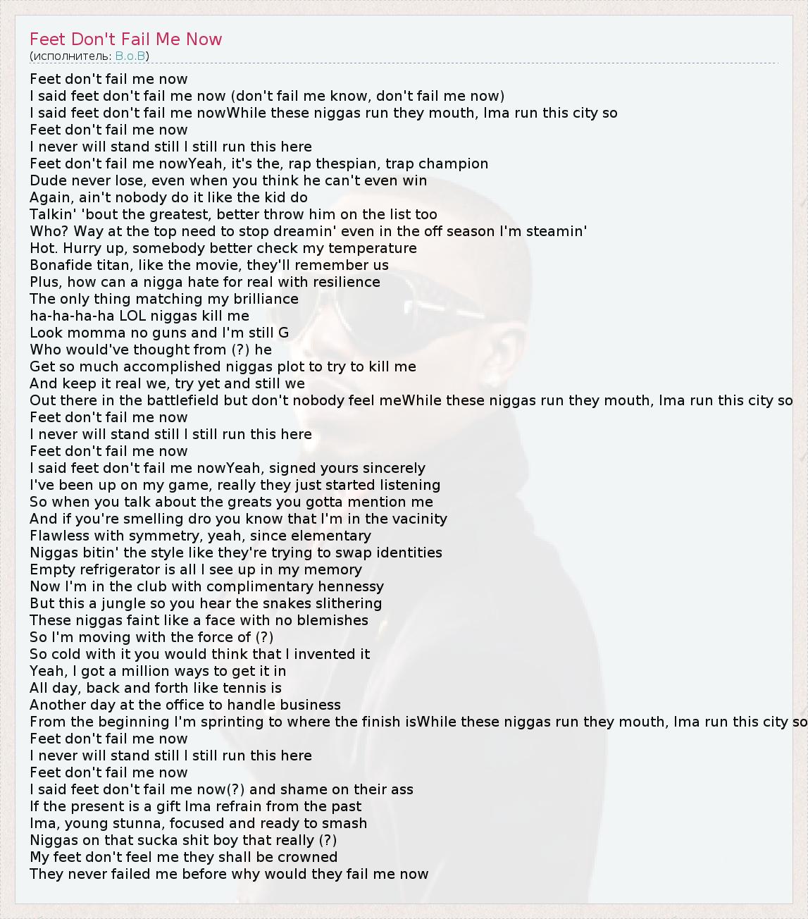 Feet don't fail me now I said feet don't fail me now (don't fail me know, don't fail me now) I said feet don't fail me nowWhile these niggas run they mouth, Ima run this city so Feet don't fail me now I never will stand still I still run this here Feet don't fail me nowYeah, it's the, rap thespian, trap champion Dude never lose, even when you think he can't even win Again, ain't nobody do it like the kid do Talkin' 'bout the greatest, better throw him on the list too Who? Way at the top need to stop dreamin' even in the off season I'm steamin' Hot. Hurry up, somebody better check my temperature Bonafide titan, like the movie, they'll remember us Plus, how can a nigga hate for real with resilience The only thing matching my brilliance ha-ha-ha-ha LOL niggas kill me Look momma no guns and I'm still G Who would've thought from (?) he Get so much accomplished niggas plot to try to kill me And keep it real we, try yet and still we Out there in the battlefield but don't nobody feel meWhile these niggas run they mouth, Ima run this city so Feet don't fail me now I never will stand still I still run this here Feet don't fail me now I said feet don't fail me nowYeah, signed yours sincerely I've been up on my game, really they just started listening So when you talk about the greats you gotta mention me And if you're smelling dro you know that I'm in the vacinity Flawless with symmetry, yeah, since elementary Niggas bitin' the style like they're trying to swap identities Empty refrigerator is all I see up in my memory Now I'm in the club with complimentary hennessy But this a jungle so you hear the snakes slithering These niggas faint like a face with no blemishes So I'm moving with the force of (?) So cold with it you would think that I invented it Yeah, I got a million ways to get it in All day, back and forth like tennis is Another day at the office to handle business From the beginning I'm sprinting to where the finish isWhile these niggas run they mouth, Ima run this city so Feet don't fail me now I never will stand still I still run this here Feet don't fail me now I said feet don't fail me now(?) and shame on their ass If the present is a gift Ima refrain from the past Ima, young stunna, focused and ready to smash Niggas on that sucka shit boy that really (?) My feet don't feel me they shall be crowned They never failed me before why would they fail me now