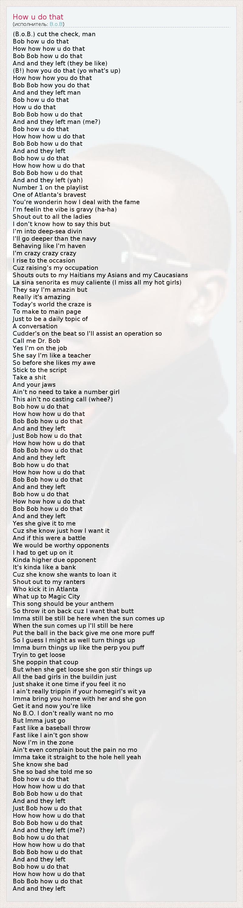 Это интересно:Бобби Рэй Симмонс-младший, Атланта, штат Джорджия (англ. Bobby Ray Simmons, Jr.; 15 ноября 1988, Уинстон-Сейлем, Северная Каролина, США), более известный под псевдонимом B.o.B — американский рэпер, продюсер и гитарист. Его дебютный сингл «Nothin' On You», записанный с Bruno Mars, занял первое место как в Соединённых Штатах, так и в Великобритании, а его второй сингл «... продолжение