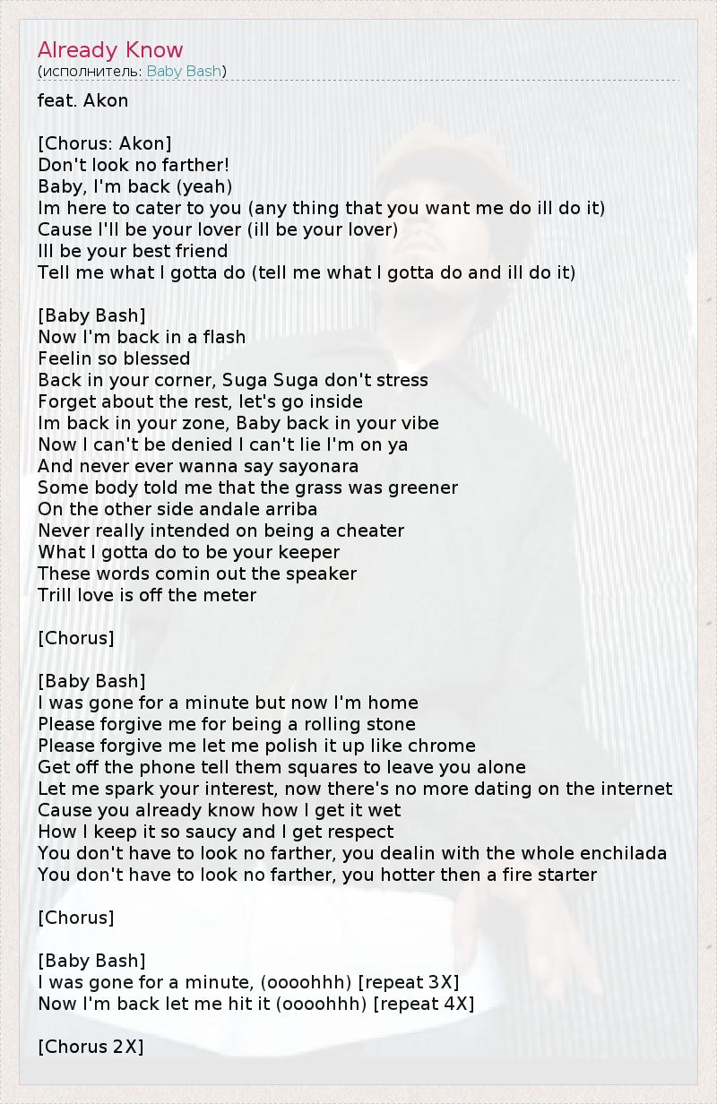 Это интересно:Baby Bash, так же известный как Baby Beesh (настоящее имя Ronnie Ray Bryant), родился 18 октября 1975 года в Калифорнии. Американский реп-исполнитель. Родители Baby Bash увлеклись героином, поэтому его воспитанием занимались его дядя и бабушка. У Baby Bash были способности к баскетболу, он даже играл в колледжской команде в середине девяностых годов. Но из-за частых травм и нежелания показываться врачу, карьера баскетболиста... продолжение