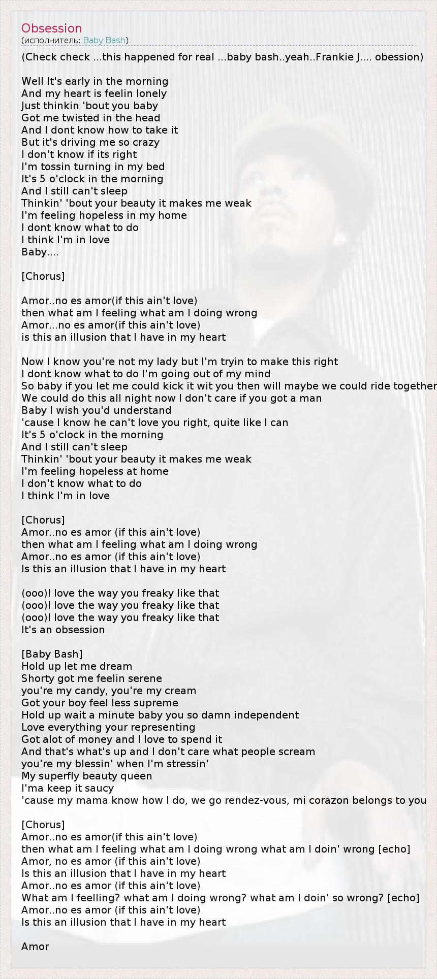 (Check check ...this happened for real ...baby bash..yeah..Frankie J.... obession) Well It's early in the morning And my heart is feelin lonely Just thinkin 'bout you baby Got me twisted in the head And I dont know how to take it But it's driving me so crazy I don't know if its right I'm tossin turning in my bed It's 5 o'clock in the morning And I still can't sleep Thinkin' 'bout your beauty it makes me weak I'm feeling hopeless in my home I dont know what to do I think I'm in love Baby.... [Chorus] Amor..no es amor(if this ain't love) then what am I feeling what am I doing wrong Amor...no es amor(if this ain't love) is this an illusion that I have in my heart Now I know you're not my lady but I'm tryin to make this right I dont know what to do I'm going out of my mind So baby if you let me could kick it wit you then will maybe we could ride together We could do this all night now I don't care if you got a man Baby I wish you'd understand 'cause I know he can't love you right, quite like I can It's 5 o'clock in the morning And I still can't sleep Thinkin' 'bout your beauty it makes me weak I'm feeling hopeless at home I don't know what to do I think I'm in love [Chorus] Amor..no es amor (if this ain't love) then what am I feeling what am I doing wrong Amor..no es amor (if this ain't love) Is this an illusion that I have in my heart (ooo)I love the way you freaky like that (ooo)I love the way you freaky like that (ooo)I love the way you freaky like that It's an obsession [Baby Bash] Hold up let me dream Shorty got me feelin serene you're my candy, you're my cream Got your boy feel less supreme Hold up wait a minute baby you so damn independent Love everything your representing Got alot of money and I love to spend it And that's what's up and I don't care what people scream you're my blessin' when I'm stressin' My superfly beauty queen I'ma keep it saucy 'cause my mama know how I do, we go rendez-vous, mi corazon belongs to you [Chorus] Amor..no es amor(if this ain't love) then what am I feeling what am I doing wrong what am I doin' wrong [echo] Amor, no es amor (if this ain't love) Is this an illusion that I have in my heart Amor..no es amor (if this ain't love) What am I feelling? what am I doing wrong? what am I doin' so wrong? [echo] Amor..no es amor (if this ain't love) Is this an illusion that I have in my heart Amor